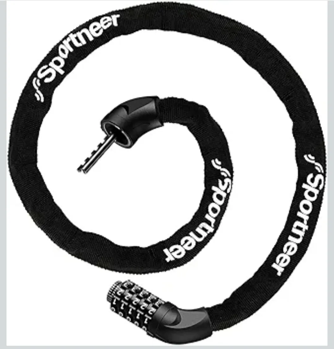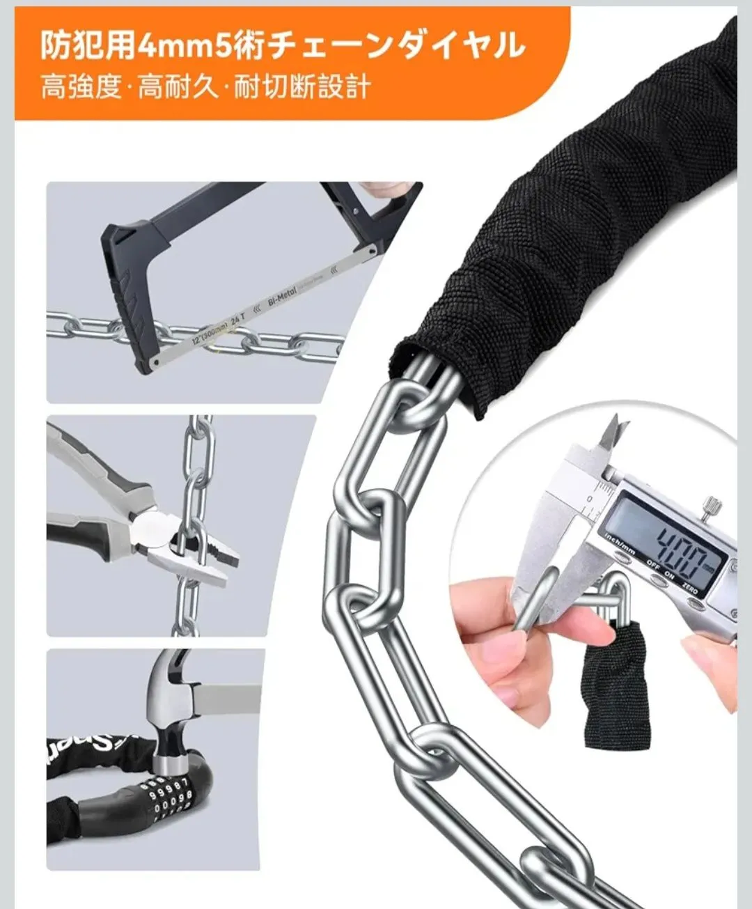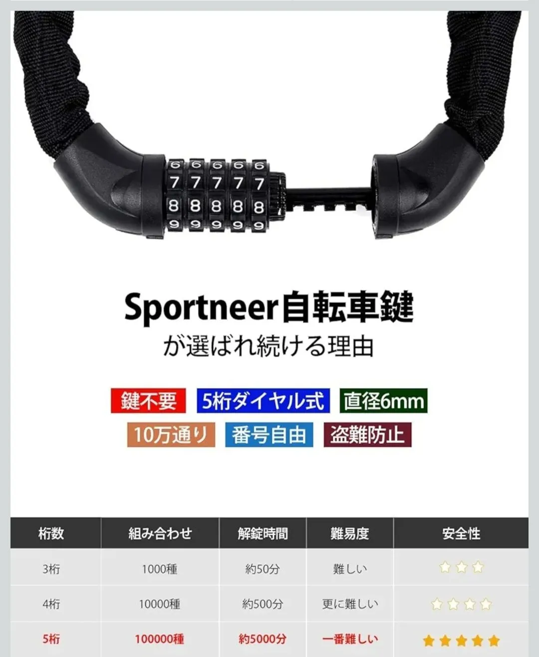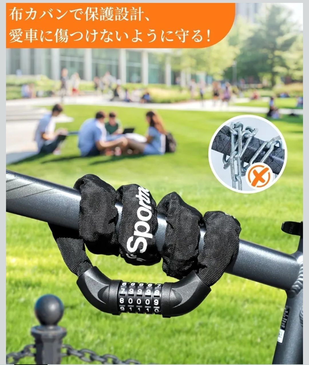 🟢盗難防止:仕様は重さ370g、太さ4mmとなっており。チェーン部分は、Sportneer厳選した高い強度のスチールを採用した上に、高熱処理加工して、ワイヤーロックより遥かに頑丈で切断にくいです。ダイヤル部分は、亜鉛強化メッキ加工して、錆びてダイヤルがまわらないなどのトラブルを防ぎます。外表は強靭性のナイロンを包んでいて、大切な愛車に守ります。