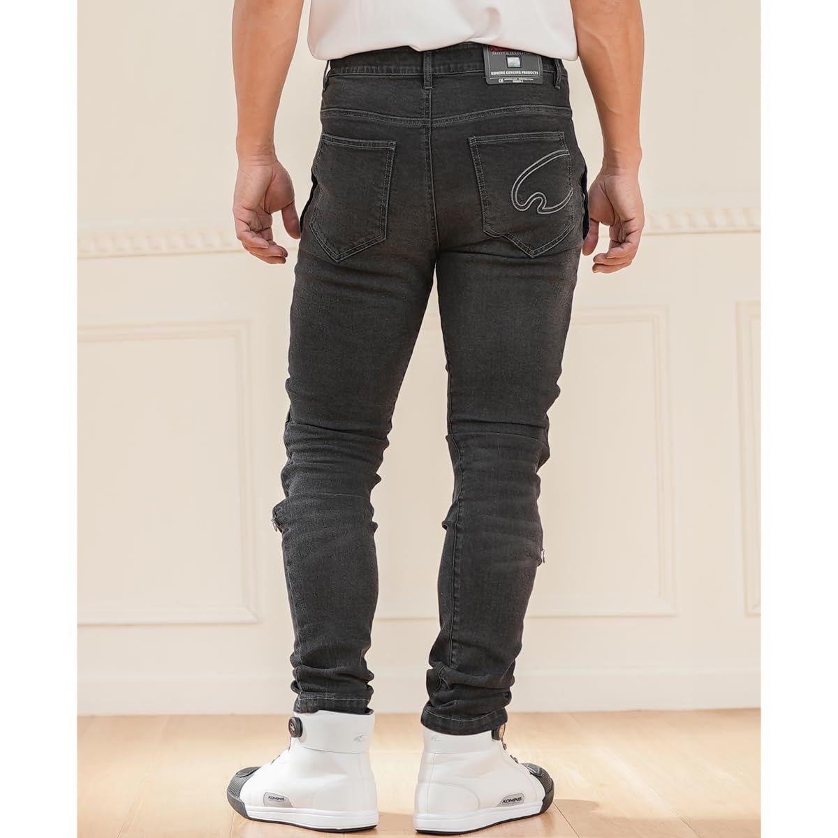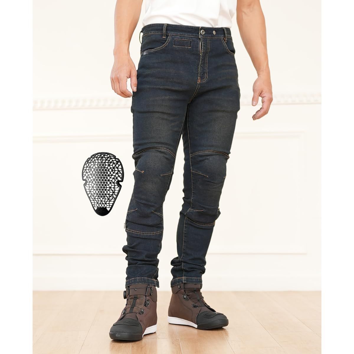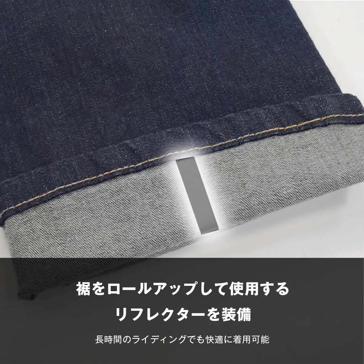 カジュアルに着こなせるシンプルなデザインのジーンズ。膝には薄型CE規格ソフトプロテクターを標準装備し、裾には夜間視認性を高めるリフレクター付き。