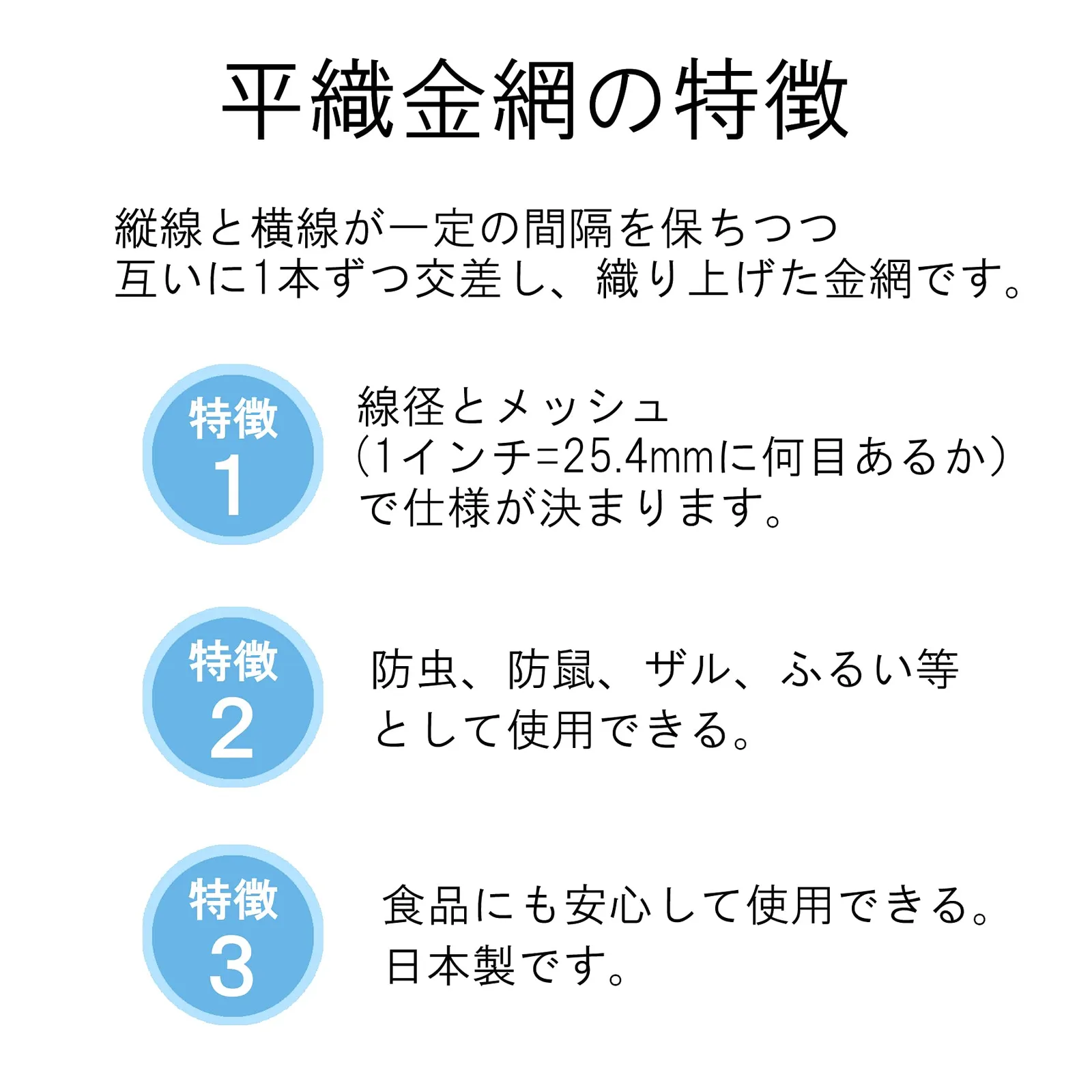 線径とメッシュ(1インチ=25.4mmに何目あるか)で仕様が決まります。
