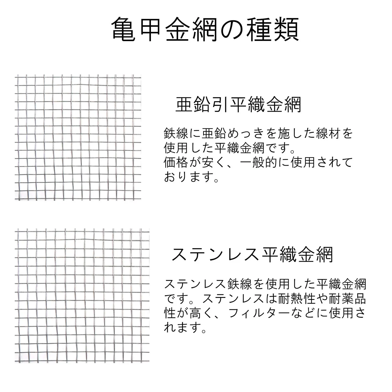 亜鉛めっき線(なまし鉄線に亜鉛めっき処理)で編んだ金網です。