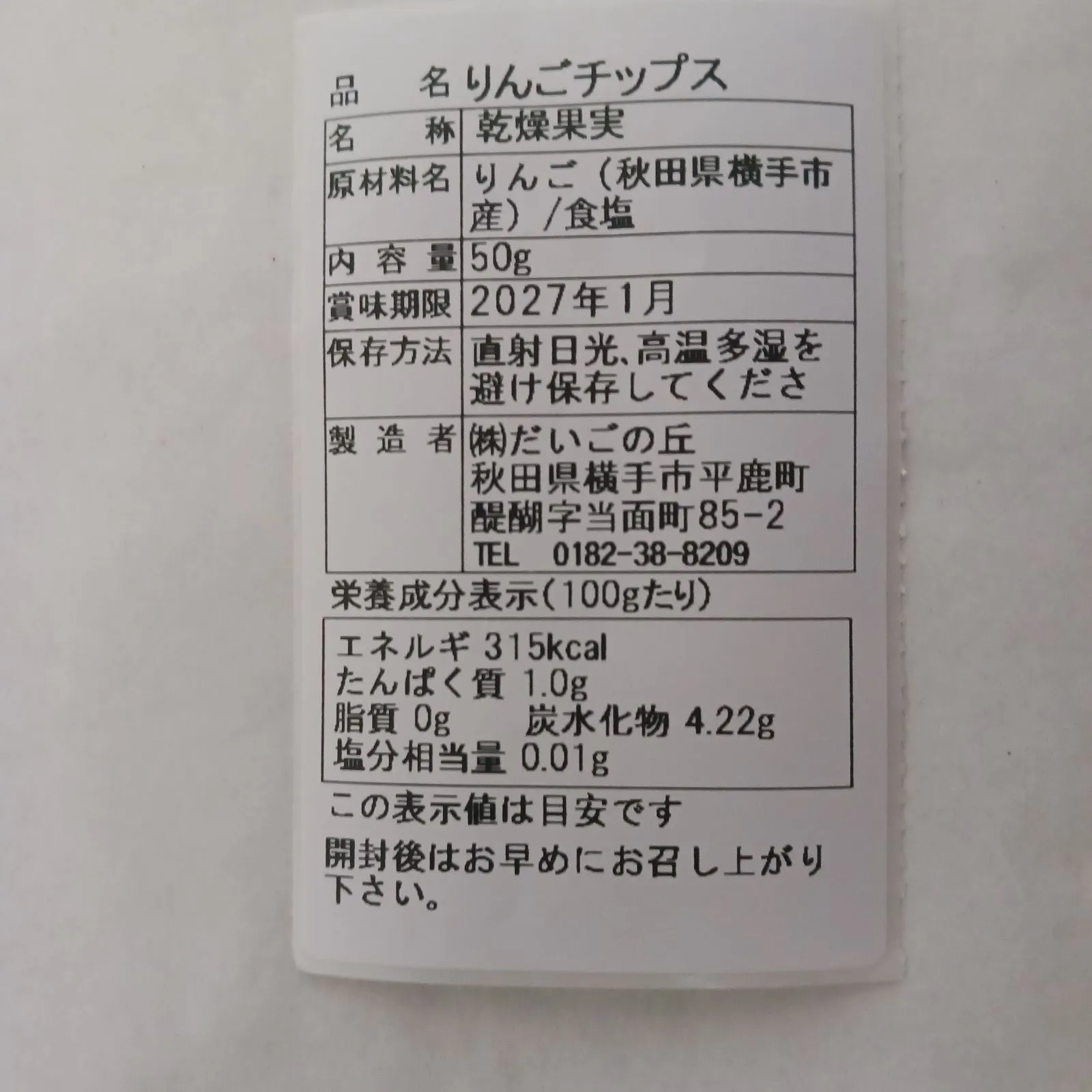 秋田県横手市産りんご + 変色防止用の微量の食塩のみ。