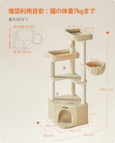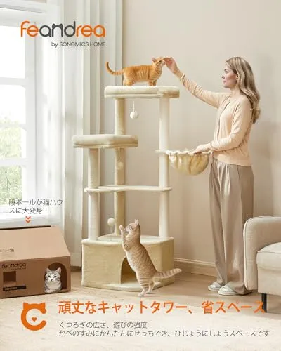 【送料無料】Feandrea キャットタワー 猫タワー 大型ハウス付き 広い見晴台 大型猫 据え置き 登りやすい コーナー型キャットタワー 子猫から老猫・多頭飼い対応 天然麻紐 爪とぎ 運動不足解消 高さ140cm ベージュ PCT009Y01