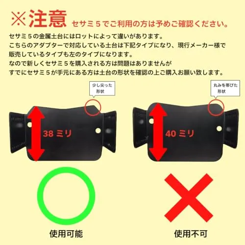 セサミ5(標準タイプ)でご利用の方はご注意ください。 セサミ5の金属土台にはロットによって違いがあり、当商品に対応するタイプはメーカーが現行で販売している物のみに対応しております。 商品説明の画像をご確認の上ご購入お願い致します。