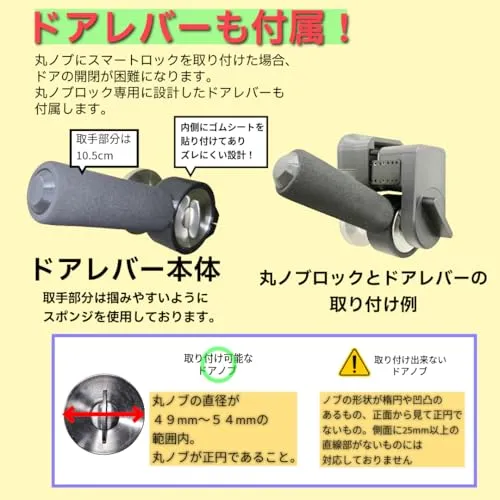 丸ノブとセサミ5の構造上、ドアノブの上部分が完全に覆われてしまいますので、今まで通りドアノブを回そうとすると確実に回し難くなります。 そこで専用設計のドアレバーもセットで付属しておりますのでオールインワンセットになります!