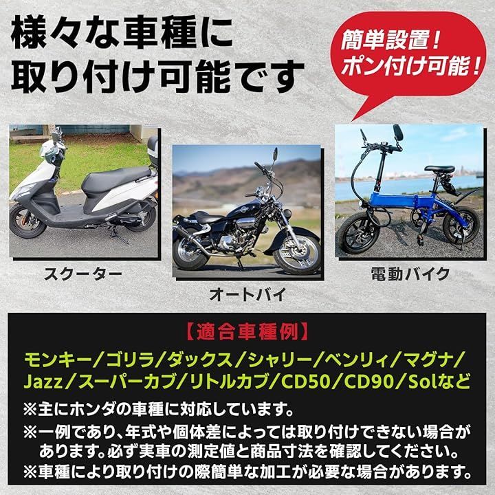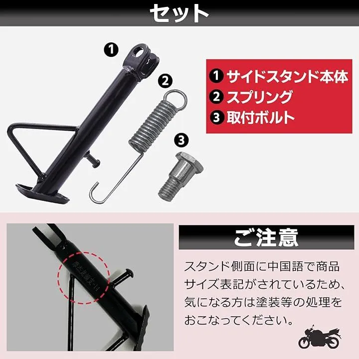 「セット内容」ショートサイドスタンド本体x1・取付ボルトx1・リターンスプリングx1 「適合車種例」モンキー、ゴリラ、ダックス、シャリー、ベンリィ、マグナ、Jazz、スーパーカブ、リトルカブ、CD50、CD90、Jazz、マグナ、Solなど*一例であり、年式や個体差によっては取り付けできない場合があります。