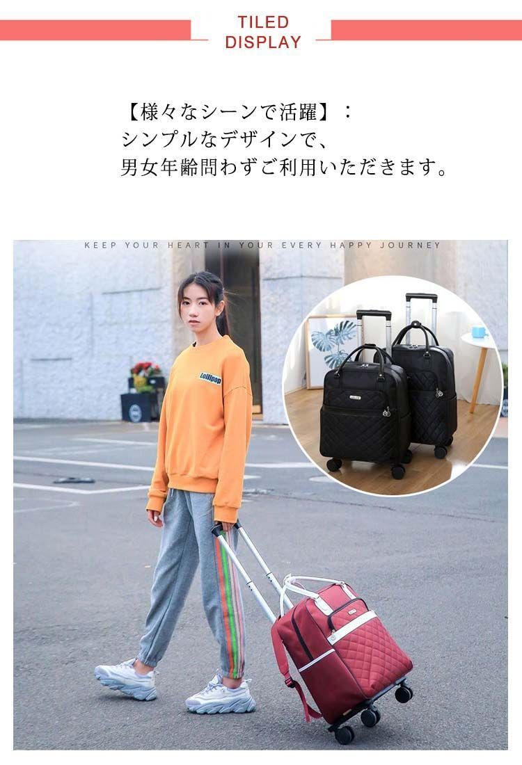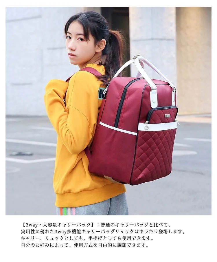 ■沖縄・離島は配送料が異なります。ご購入前にコメントをお願いいたします。 サイズ - M:38×20×42cm - L:42×21×47cm 素材 撥水オックスフォード素材 カラー ブラック、ローズピンク、ワインレッド、レッド、パープル --- 3way・大容量キャリーバッグ 通常のキャリーバッグより実用性に優れた、多機能3wayキャリーバッグリュックです。 キャリー・リュック・手提げの3通りの使い方が可能で、シーンや好みに合わせて自由にスタイルをお選びいただけます。 大容量設計のため、旅行や出張時に靴、衣類、本、雑誌、10.5インチタブレット、17インチノートパソコン、日用品など様々な物品をまとめて収納可能。2〜3泊程度のご旅行や出張に最適です。 主な仕様 - 収納容量:約25L - 外形サイズ:40cm×36cm×20cm - 素材:ポリエステル - ポケット構成:大小さまざまなポケットを備え、小物から傘、靴、PC、衣類まで整理して収納できます - 男女兼用デザイン 高品質素材 耐久性に優れたポリエステル素材と金属ジッパーを採用。縫製がしっかりしており、通気性・柔軟性・速乾性に優れ、抗菌加工も施されています。撥水機能付きで、雨や雪の日でも中身を守り、汚れも拭き取りやすい仕様です。 使いやすい機能 - 多段調節キャリーバー:アルミ製軽量キャリーバーは2段階で高さ調節可能 - 高品質キャスター:静音性と耐摩耗性に優れた高弾性ゴムキャスターを採用。凸凹路面でも安定した移動を実現します 様々なシーンで活躍 シンプルで使いやすいデザインのため、旅行、出張、通学、合宿、アウトドア、ショッピング、帰省、スポーツなど多様な場面でご利用いただけます。プレゼントにもおすすめです。