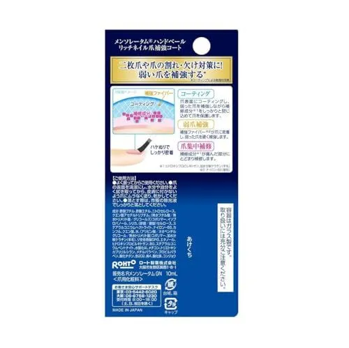 ◆商品名:メンソレータムハンドハンドベール爪の割れ二枚爪爪コーティングツヤなしリッチネイル爪補強コート10ml 内容量:10ml 仕上がり:ツヤなしタイプ ハケぬりタイプ 容器:ガラス製(取り扱いには十分ご注意ください。) 補強ファイバー配合 商品紹介ハケで塗ってしっかり密着する爪補強コートです。無色の液体が爪表面をコーティングし、弱った爪を補強しながら補修成分※1をしっかりと閉じ込めて爪を保護!また、補強ファイバー※2が爪に密着し、弱った爪を硬く補強します。塗った後は自然に仕上がるツヤなしタイプ。落とす時は市販の除光液でしっかり落としてください。※1:ヒドロキシプロピルキトサン、加水分解ケラチン(羊毛)※2:ナイロン-66(基剤)使用方法<使用方法>