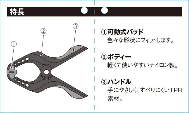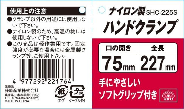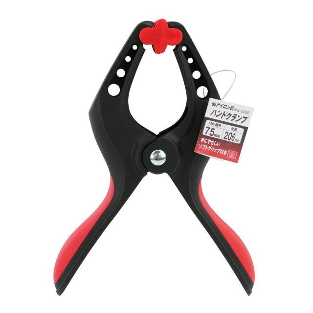 ◆商品名:SK11(エスケー11)ナイロン製ハンドクランプ口開き75mmSHC-225S 本体:ナイロン製、ハンドル:tpr樹脂、はさみ部:pe樹脂 口の開き:75mm サイズ:l206×w148×h41mm アゴの深さ:84mm 重量:198g 手にやさしいソフトグリップ付き