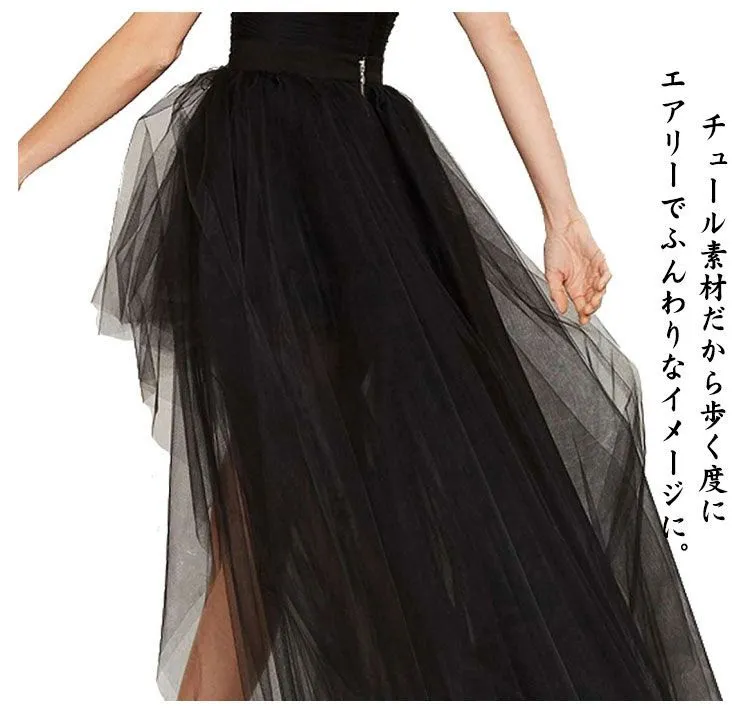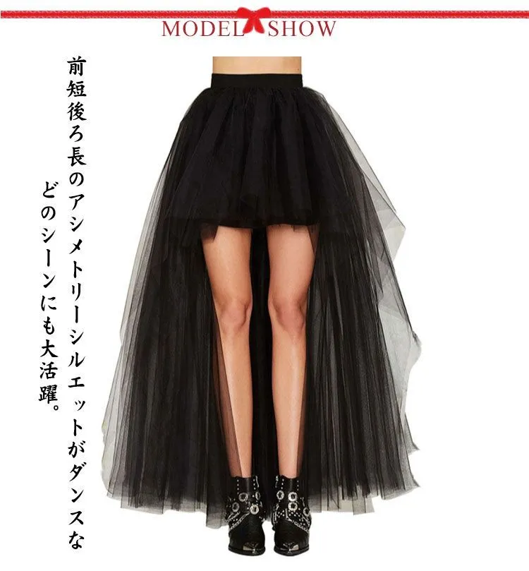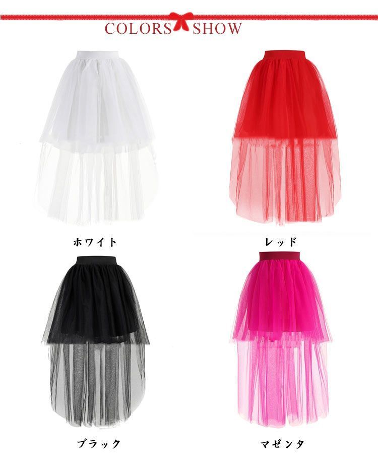 ■沖縄・離島は配送料が異なります。ご購入前にコメントをお願いいたします。 商品情報 サイズ:F サイズ詳細:ウエスト60-96cm / 前丈50cm / 後ろ丈100cm 素材:ポリエステル カラー:ホワイト、レッド、ブラック、マゼンタ --- 商品の特徴 * 女性らしい上品さが際立つ、レディ向けチュールスカートです。 * 前短後ろ長のアシメトリーシルエットが特徴で、ダンスなどの動きのあるシーンでも活躍します。 * チュール素材を使用しているため、歩くたびに軽やかでふんわりとした印象を与えます。 * ウエスト部分は広幅ゴムを使用しており、着用感が快適です。 * 季節を選ばず、一年中お使いいただける万能なスカートです。