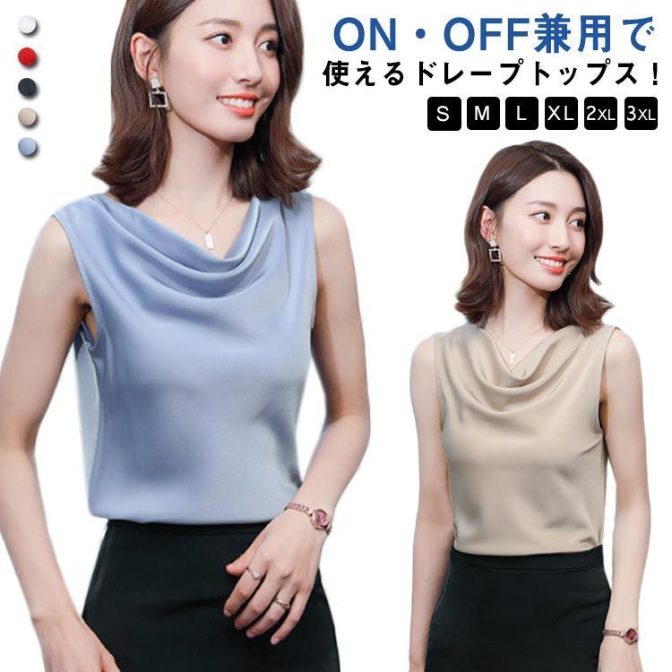 ■沖縄・離島は配送料が異なります。ご購入前にコメントをお願いいたします。 サイズ S / M / L / XL / 2XL / 3XL ※平置き実寸です。実寸は商品により1-3cm程度の誤差が生じる場合があります。 素材 ポリエステル、スパンデックス カラー ホワイト、レッド、ブラック、ベージュ、ブルー 商品の特徴 ・ON・OFF兼用で使えるドレープトップスです。 ・軽めの落ち感があるサテン素材で、ネックラインにドレープを施しています。 ・さらっとした肌触りで、夏にぴったりの涼やかな着心地です。 ・エレガントで上品なデザインのため、ちょっとしたお呼ばれやフォーマルな席にもおすすめです。 ・ジャケットのインナーや、レイヤードスタイルのチラ見せとしてもコーディネートを華やかにします。 ・マーメイドスカートやテーパードパンツなど、様々なボトムスとの相性が良い万能アイテムです。