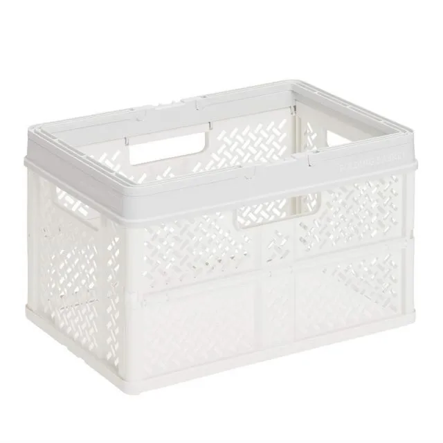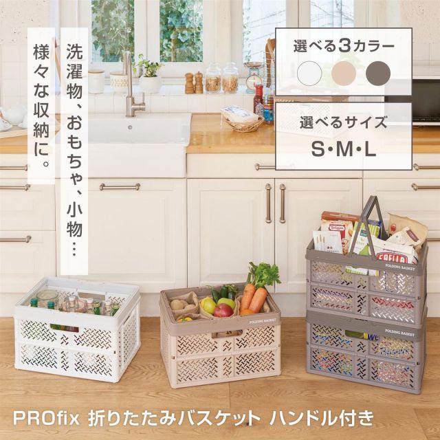 【折りたたみ時高さ7cm】 ハンドル付きで持ち運びやすいバスケット! 取っ手と中央部の持ち手もあるので、どこからでも持ち運びラクラク! Lサイズの上に2個並べて重ねられるサイズです。 車、キッチン、キッズ収納、ランドリー、様々な場所で活躍します。