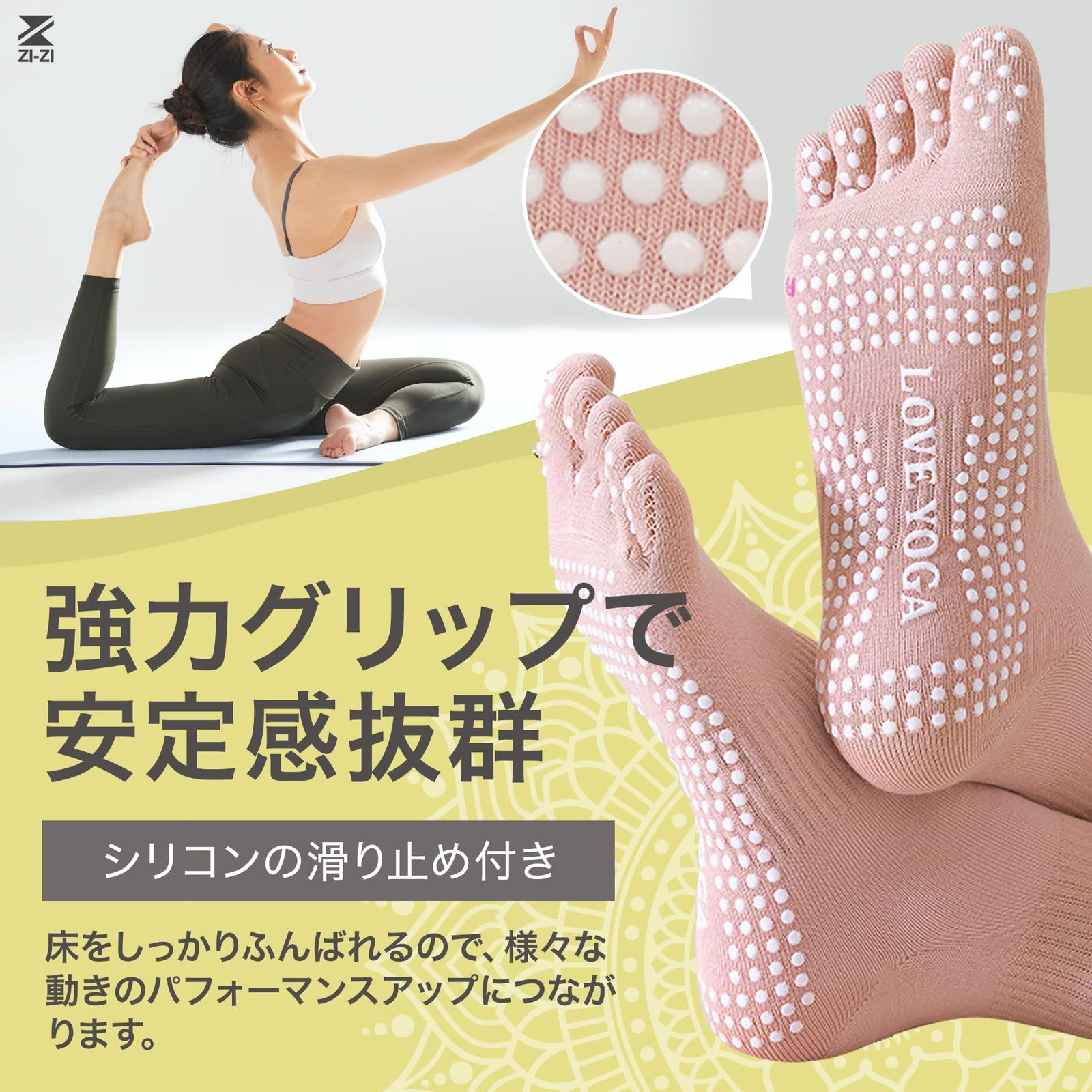 【足裏の強力グリップ】指先までカバーした足裏全面にあるシリコンの滑り止めと5本指は、安定性があり床をしっかりふんばることができるため、様々な動きのパフォーマンスアップにつながります。ヨガ・ピラティス・フィットネス ランニングなどの動きを妨げず、より快適にお楽しみいただけます。