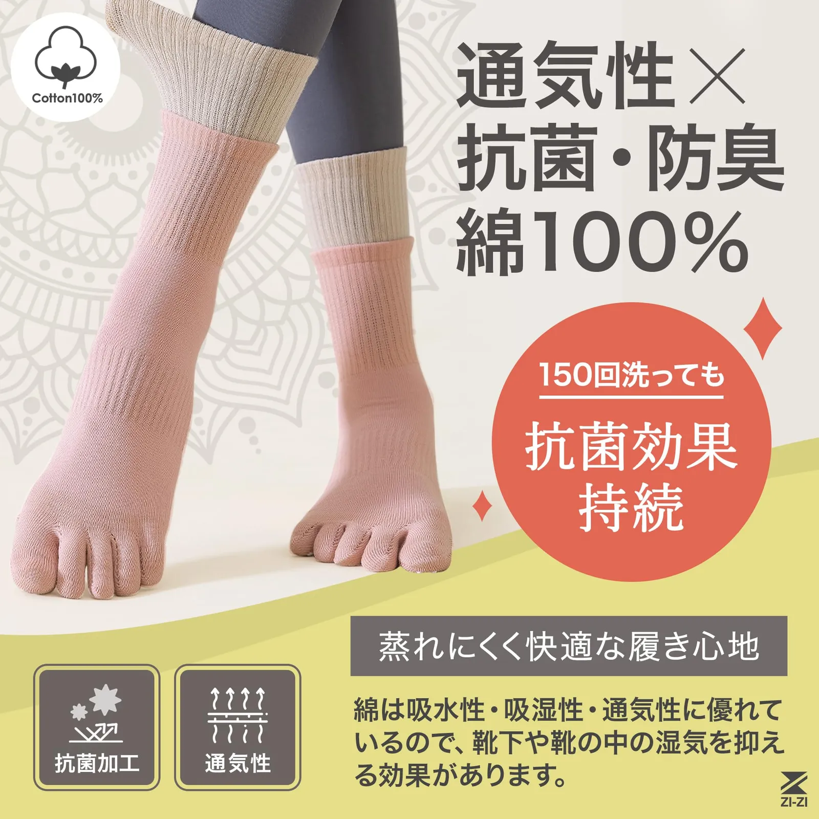 【通気性×抗菌・防臭】本体足部分に使用している綿は、吸水性・吸湿性・通気性に優れているので、靴下や靴の中の湿気を抑える効果があります。また、靴下本体に抗菌加工を施しているので、汗をかきやすい足の気になる臭い対策もバッチリ◎150回洗っても抗菌効果は持続します。