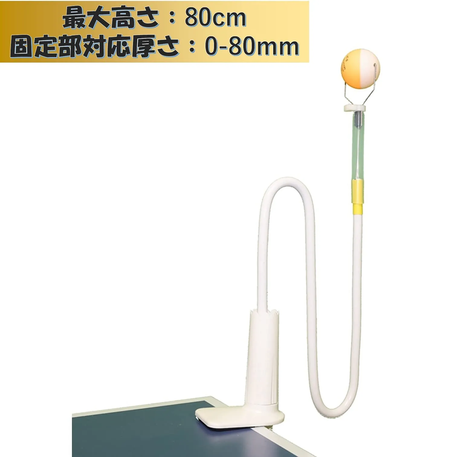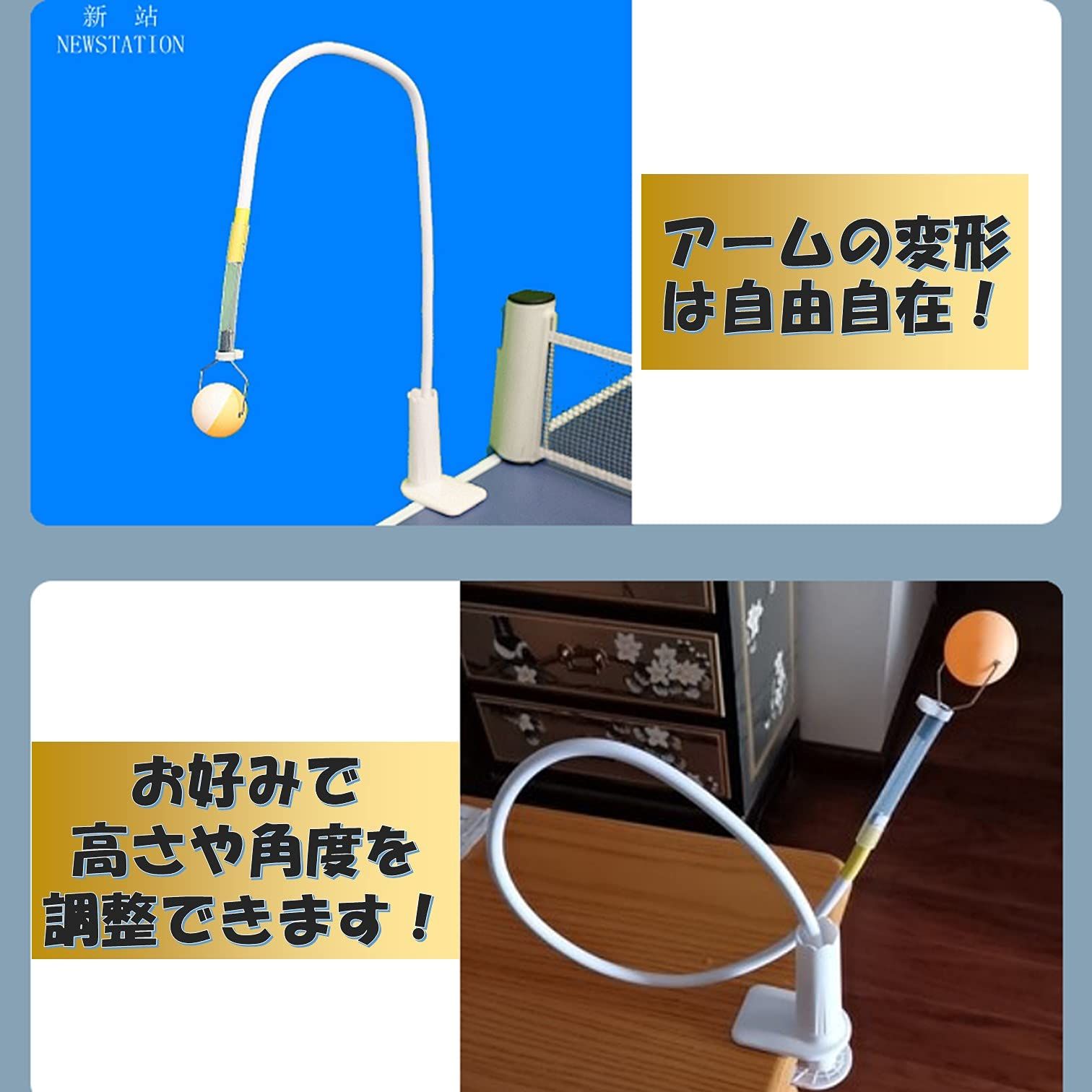 卓球台に取り付け、自由な高さに球の位置を調整でき、ボールの回転が分かりやすい2トーンカラーなのでスピンの練習やフォームの修正に最適です!また、ボールがアーム先端に固定されているため、球拾いの必要がありません。