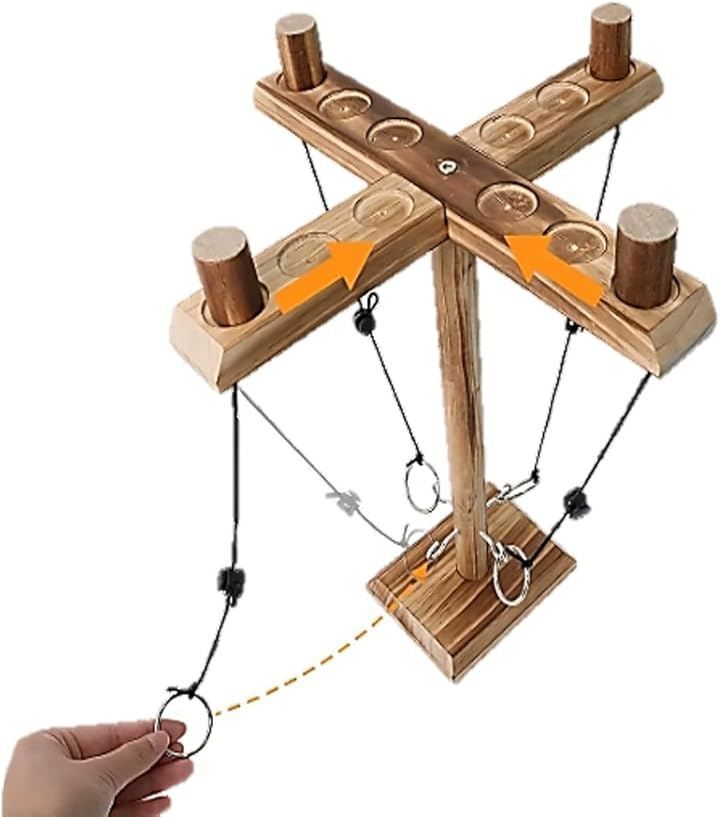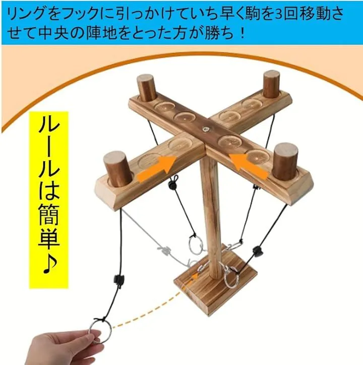 「リングトスゲーム 遊び方」ロープに吊るされたリングを振り子の原理でスイングさせて柱のフックにひっかける。
