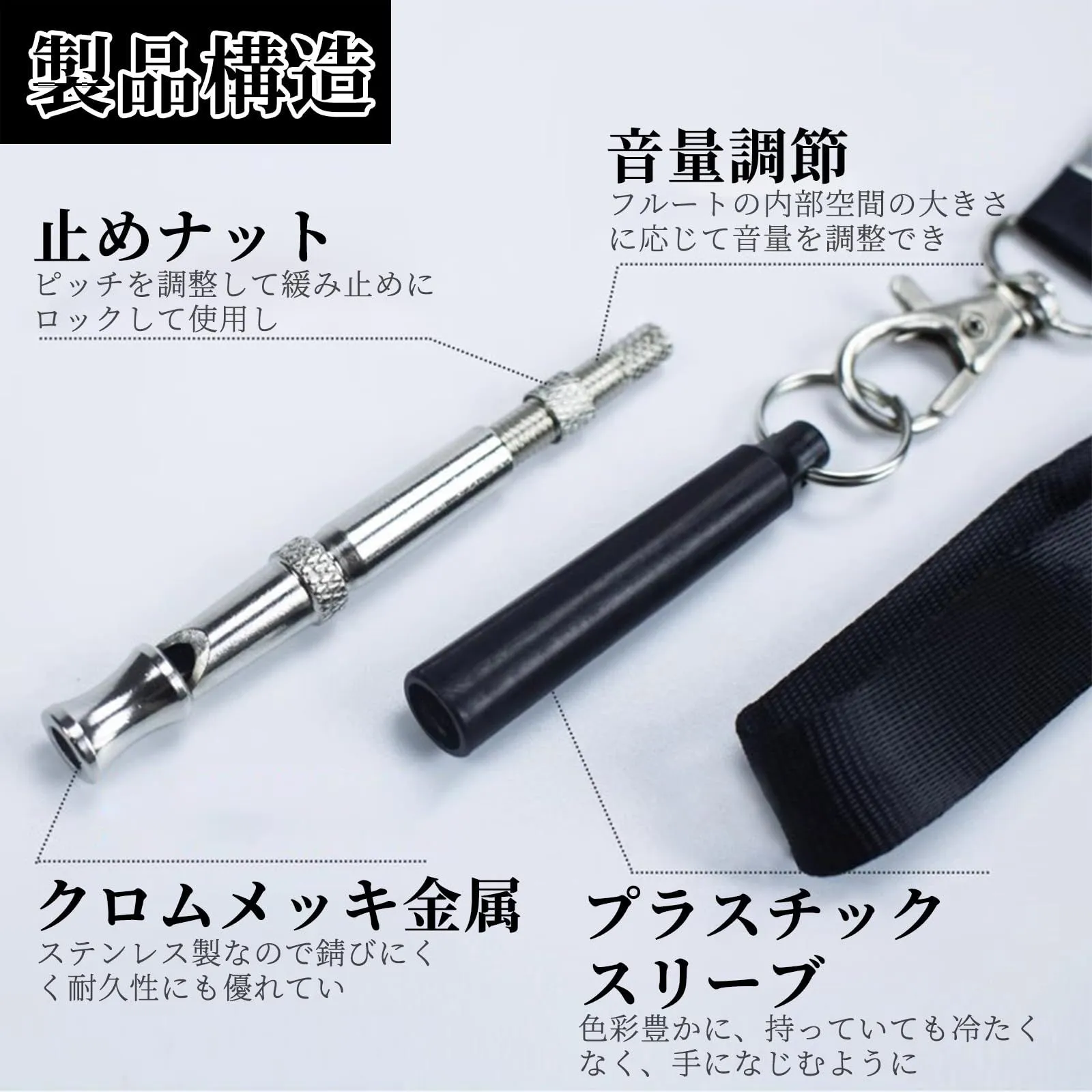【吊り下げチェーン付き】当社の超音波犬用トレーニングホイッスルには吊り下げチェーンが付属しており、いつでもどこでも簡単に持ち運びできます。軽くて身体への負担も少ないです。このホイッスルは携帯電話のストラップやキーホルダーに簡単に掛けられるので、持ち運びに便利です。