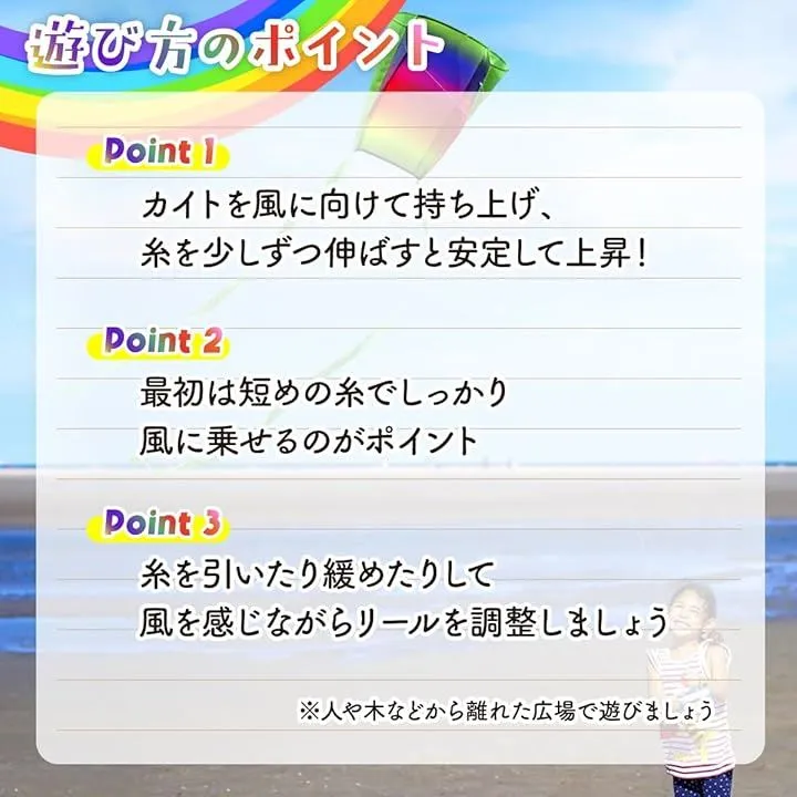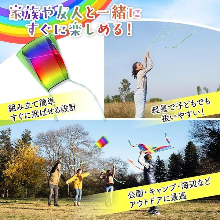 公園や海辺、広場、キャンプ場など様々な屋外シーンで手軽に使用でき、休日や休暇に親子で凧揚げを楽しむのに最適です。