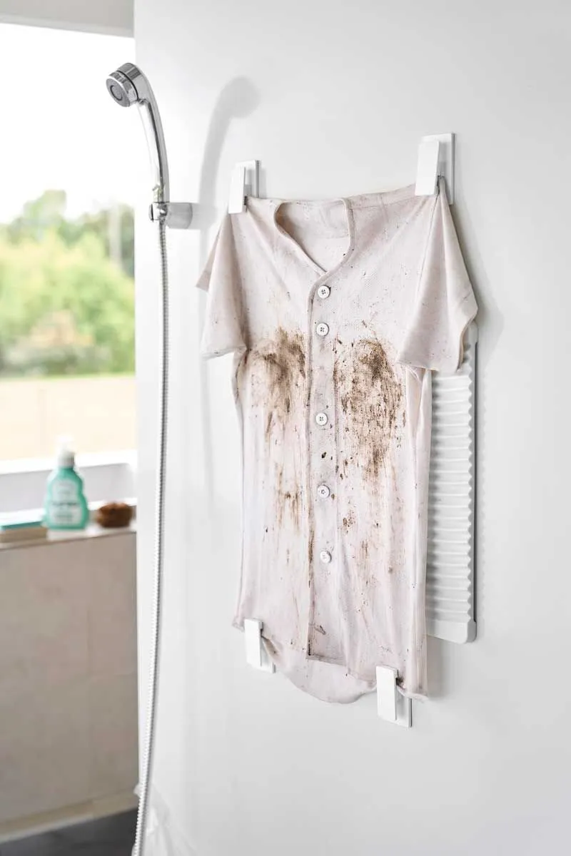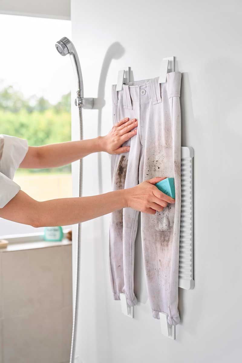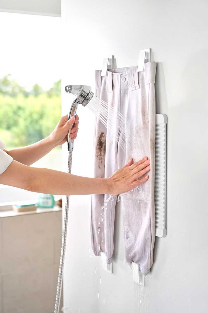 汚れの位置や洗濯物のサイズに合わせて、洗濯板やクリップの位置を簡単に調整できます。たわしやブラシを使えばさらに効率よく手洗いでき、落とした汚れはそのままシャワーでサッとすすぎ洗いできます。クリップは、洗濯以外に活用するのもおすすめです。