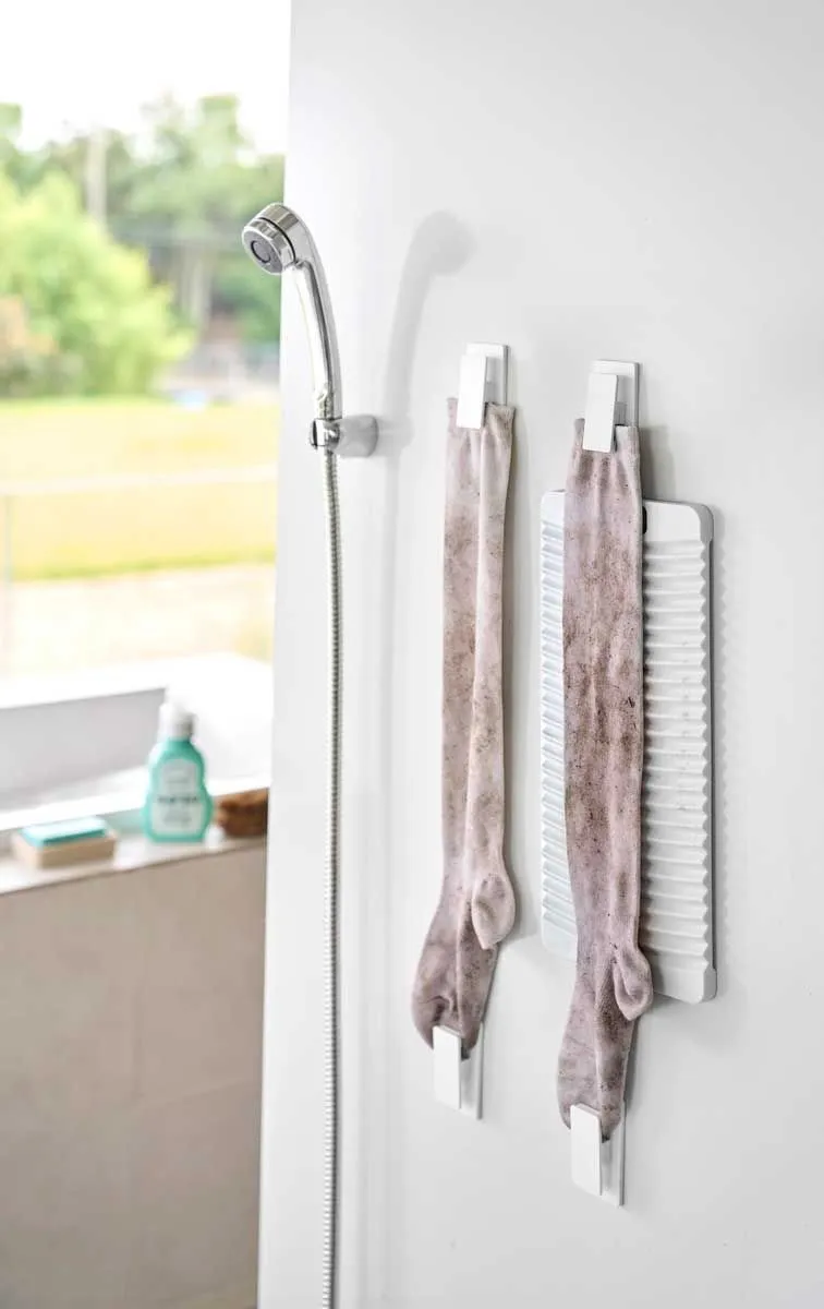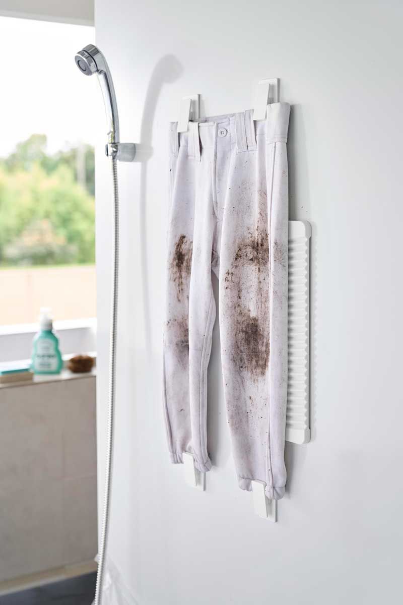 マグネットで壁面に設置できる洗濯板とクリップです。浴室の壁面に洗濯板を貼り付け、広げた洗濯物をマグネット付きクリップで固定すれば、擦り洗いがスムーズに。腰をかがめず無理のない姿勢で手洗いでき、広い範囲を一気に洗えて便利です。