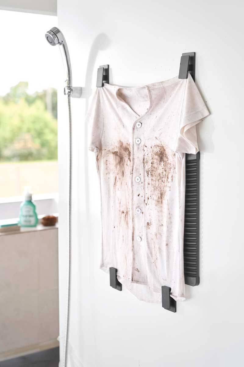 マグネットで壁面に設置できる洗濯板とクリップです。浴室の壁面に洗濯板を貼り付け、広げた洗濯物をマグネット付きクリップで固定すれば、擦り洗いがスムーズに。腰をかがめず無理のない姿勢で手洗いでき、広い範囲を一気に洗えて便利です。