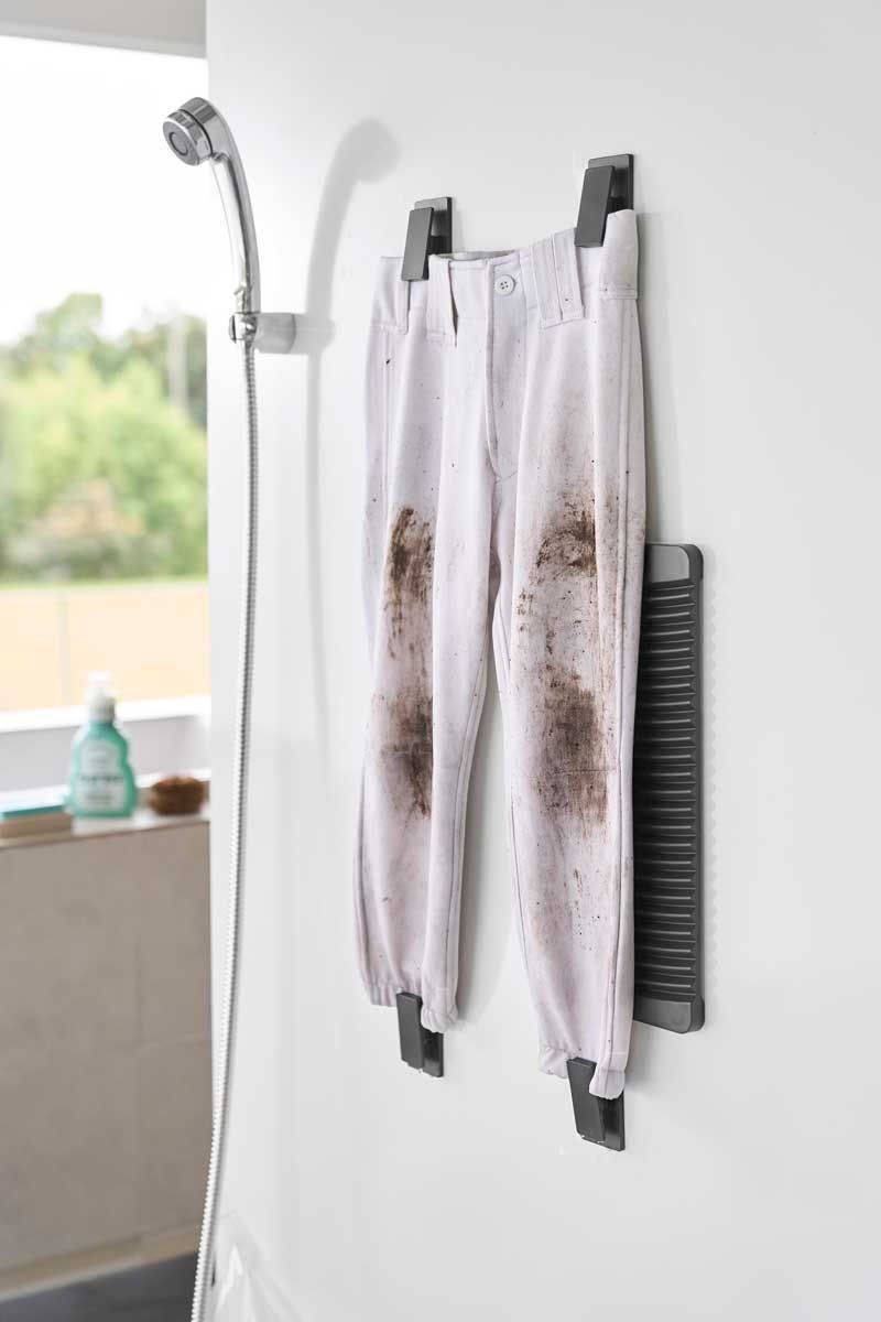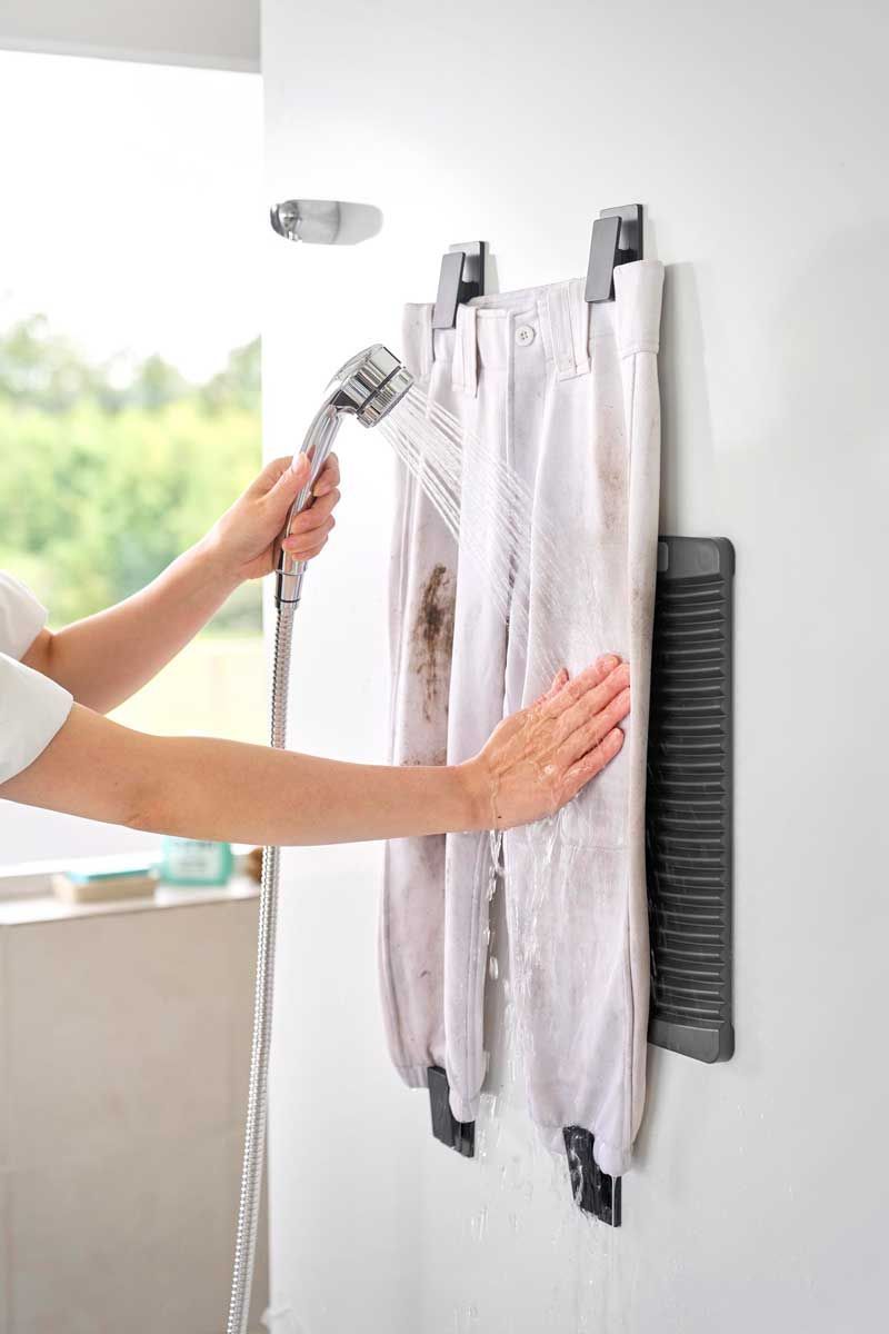 汚れの位置や洗濯物のサイズに合わせて、洗濯板やクリップの位置を簡単に調整できます。たわしやブラシを使えばさらに効率よく手洗いでき、落とした汚れはそのままシャワーでサッとすすぎ洗いできます。クリップは、洗濯以外に活用するのもおすすめです。
