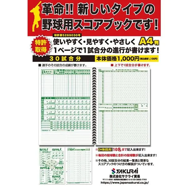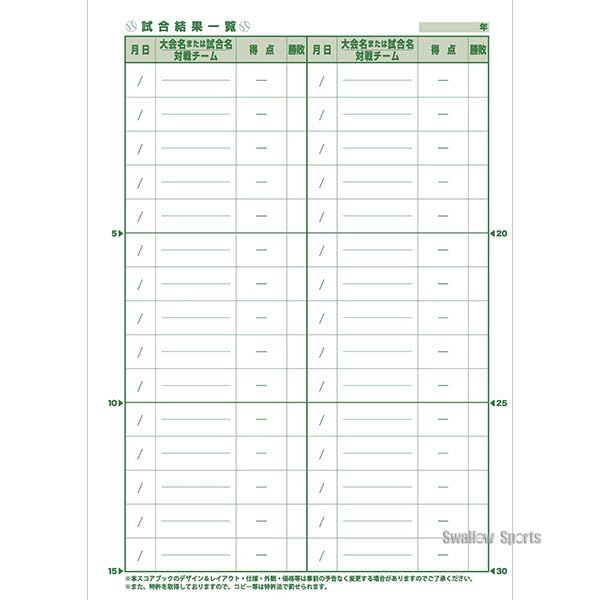 ●画像では記載できる人数が9人ですが、10人に変更になっています 1、30試合分の結果一覧表とスコアブックの付け方の解説書付きです。 2、使いやすく・見やすく・やさしく、1ページで1試合分の進行がかけます。 →A4サイズ1ページで1試合分のスコアがおさまるので、使いやすくて見やすい! ページ左面では各選手のその試合での成績が記録できます。 3、1ページ目に30試合の試合結果一覧があり、一目瞭然に結果をわかります。 4、試合開始時間記入欄と両チームのタイム回数をカウント欄があり、さらに監督名欄とコーチ欄(4名まで)がございます。 親切なつくりになっているのでおすすめです! 先攻、後攻の両方のスコアを1ページで記入できるため、表裏を攻撃ごとにめくる必要がなくストレスフリーです! また、裏面に打者や投手のデータを集計して総評を記入できる仕様になっています! このスコアブックには硬さがあり、テーブルのない場所などで手に持ったままや膝の上でスコアを書くことができます! スコアの書き方や、忘れがちな塁間などの距離も記載してあるので、このスコアブック1冊 ※※およそのサイズ・重量 0×0×0 0g