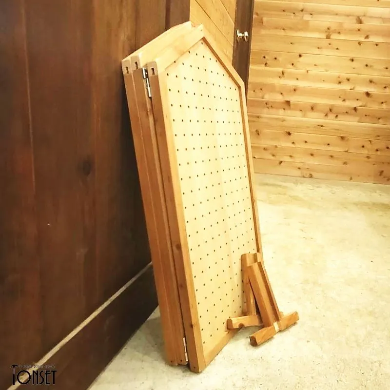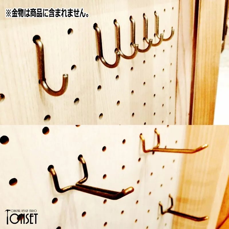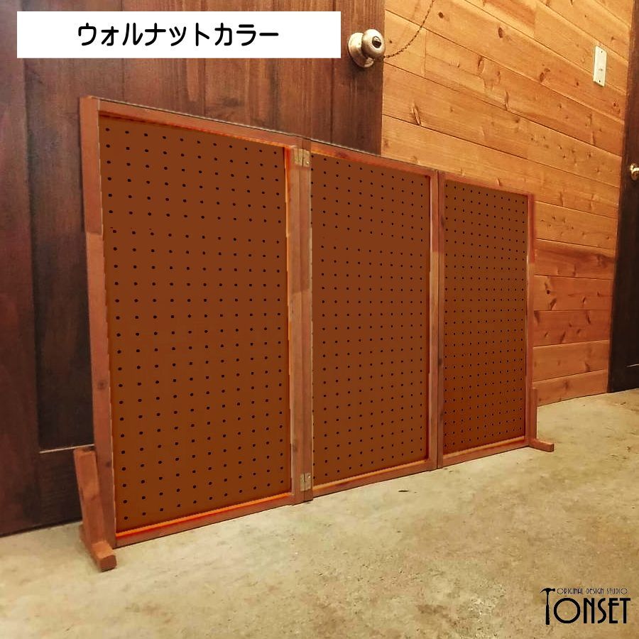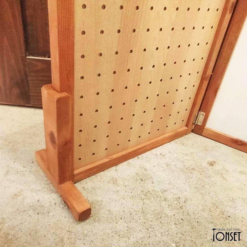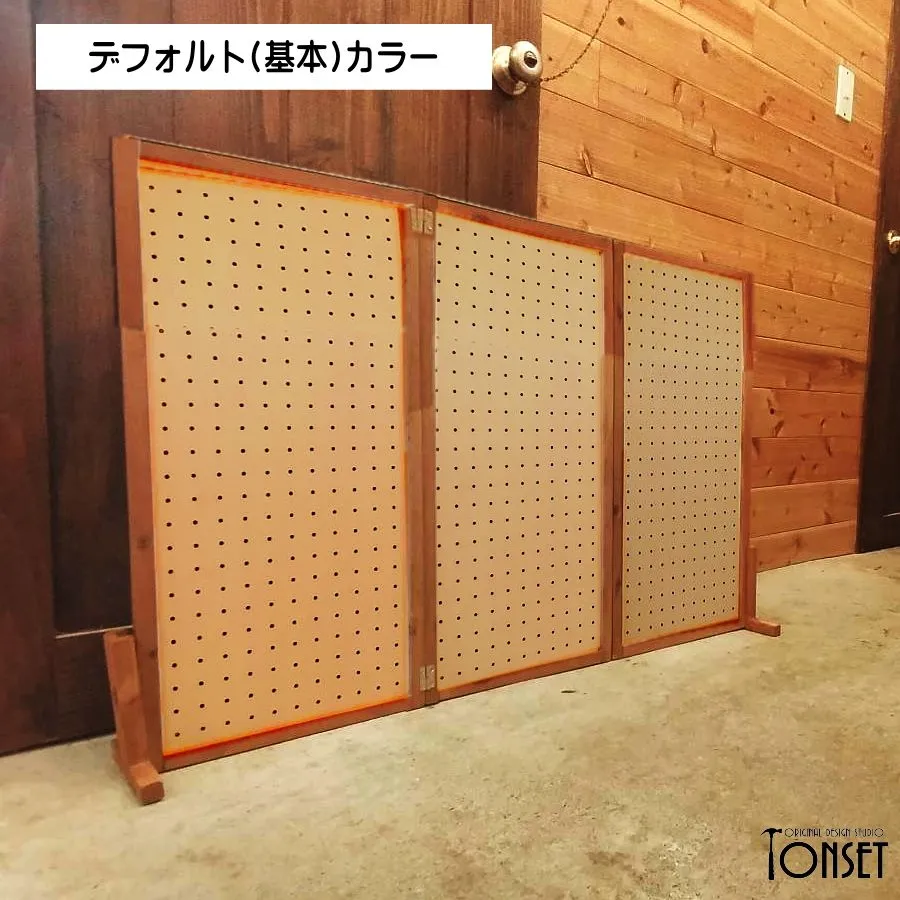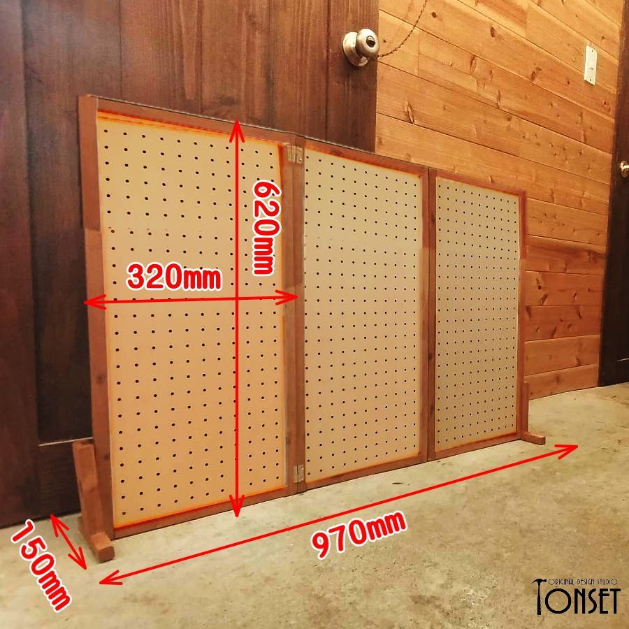 【受注生産商品】:製作納期 約5〜6日 穴あきパネルを3枚連結したイベント什器です。 上辺を三角に屋根モチーフにしたバージョンとは別に、収容量優先!でまっすぐのままにしたバージョンです。 穴あきパネルを使っているので専用の金物で自由に商品のレイアウト展示ができるようになっています!(※金物はお客様でご準備ください。) 抜き差しができる特殊な丁番を使っているので、パネルを分離することが可能ですので、1枚単独での使用や2連結での使用などもできるため汎用性も高く、付属のスタンド脚で自立しますので簡単に展示展開ができます。 もちろん折り畳み可能ですので、収納性もよく運搬も簡単です。 パネルの色も裏表で違う色、さらに3枚とも違う色などにすることも可能ですし、統一することも可能です。(※オプションからお選びください。) また「表・裏・表」や「裏・裏・表」のような組み合わせ方もできるので、いろんなレイアウトを表現することも可能になっています!! ★パネルカラーについて★ 商品名のカラー名は「片面のみ」の色です。裏面は画像3枚目の通り素地のままとなっておりますのでご注意ください。 両面に色を塗りたい場合は追加料金となりますので、事前にお問合せくださいませ。 ★製品概要★ ・サイズ:(本体)約幅970mm×奥行150mm×高さ622mm ・使用木材:スギ、合板 ・使用塗料:水性ステイン塗料、水性アクリル塗料 ★使用上のご注意★ ・こちらは自然素材を使用した製品となりますので、経年劣化で現状より木部同士の隙間が大きくなる可能性もあります。 ・商品によって多少のサイズ誤差、木部同士の隙間の大小、塗装ムラなどがございますが、手作り品の味や雑貨特有のラフさの演出としてご理解ください。 ・棚部分にはあまり重たいものを載せないでください。安定感が損なわれたり、棚が破損する可能性が高くなります。 ・特に防水性のある塗料を塗布してませんので、屋外での使用は雨濡れにはご注意ください。 価格を抑えるために下記の部分を省略製作していますのでご確認ください。
