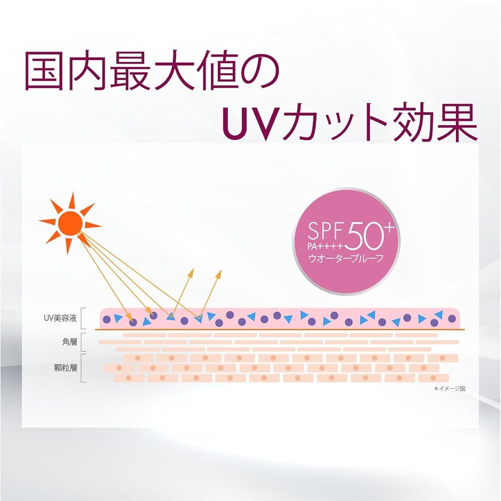 【365日UVダメージから肌を守り、シミに悩まない生活を】 ①国内最高値※2SPF50+ / PA++++のUVカット力。 ②ウォータープルーフタイプ③美容成分83%配合で、しっとり肌へ導きます