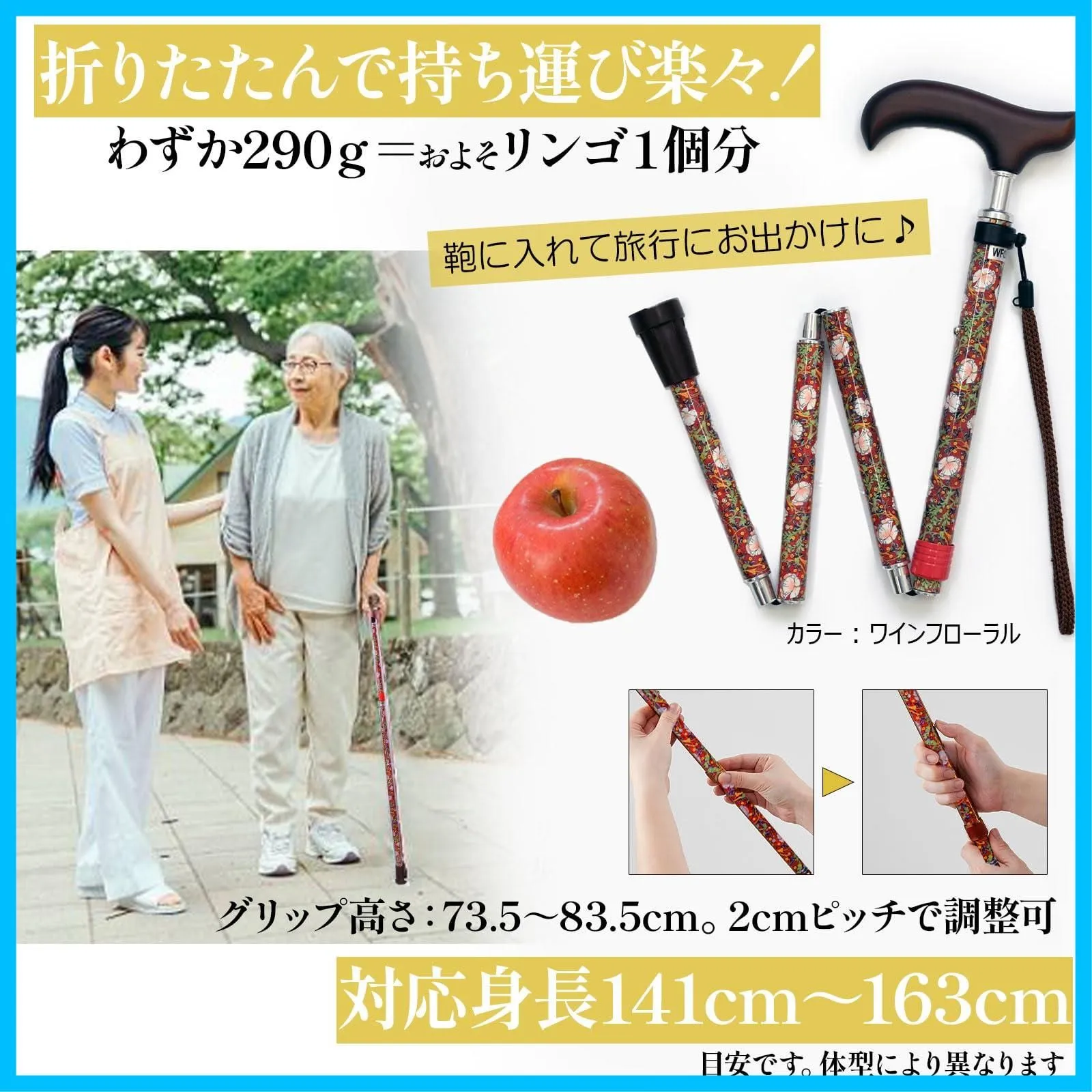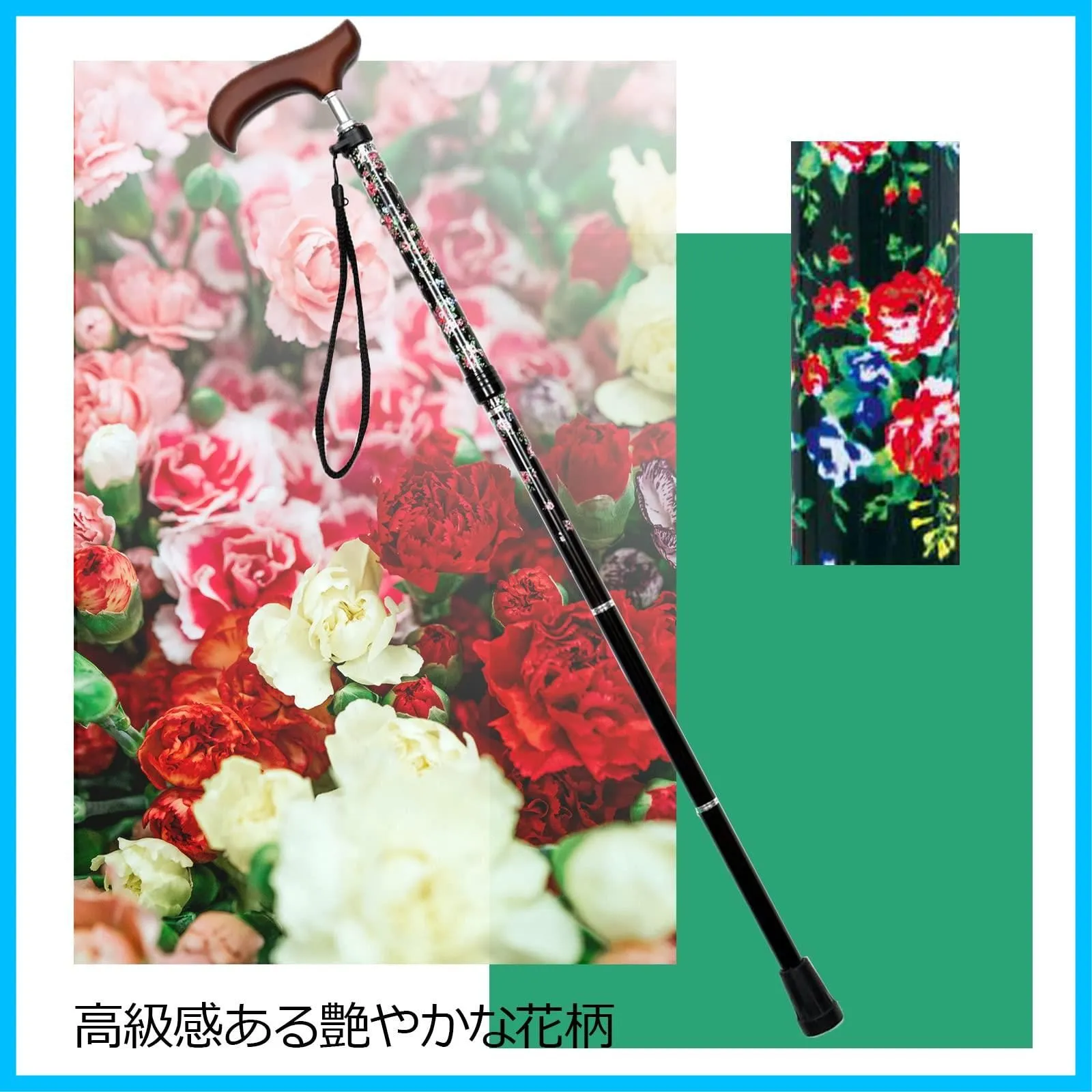 どんなシーンにもぴったり日々のお出かけ、旅行に、フォーマルに。華やかな色柄のおしゃれな折りたたみ杖です。今まで杖を使うのをためらわれていた方からも、気持ちが明るくなったと好評いただいております。