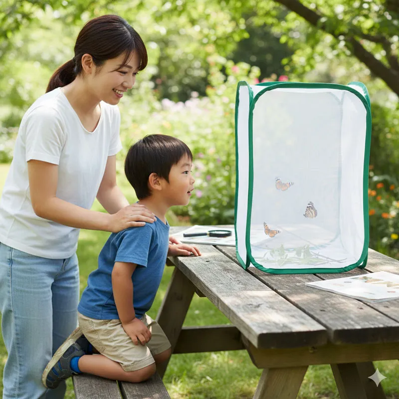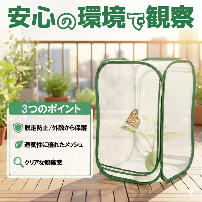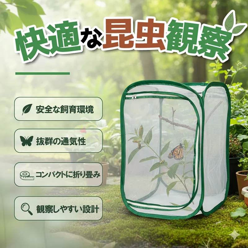 【商品仕様】 商品名: ポップアップ式昆虫飼育ケージ サイズ: 幅37cm×奥行37cm×高さ60cm(折りたたみ時:直径約20cm) 材質: ポリエステル(メッシュ)、スチール 付属品: 本体、収納用ゴムバンド(一体型) 細かなメッシュ素材を採用した、通気性抜群の昆虫飼育ケージです。 蝶やカマキリ、爬虫類などの観察に最適で、蒸れを防ぎながら安全な飼育環境を維持します。 大きな開口部はダブルファスナー仕様で、生体の出し入れや清掃、餌やりがスムーズに行えます。 高さ60cmのゆったりサイズなので、中に鉢植えや止まり木をそのまま入れることも可能です。 植物を害虫から守る保護カバーとしてもご使用いただけます。 軽量かつポップアップ式のため、ひねるだけで簡単に折りたたんで直径約20cmまでコンパクトに収納できます。 持ち運びも楽々なため、夏休みの自由研究や昆虫採集、野外での観察にも大変便利です。 汚れた際のお手入れも簡単で、長く清潔にご愛用いただけます。 虫かご むしかご ビニールハウス 簡易 温室 植木鉢 遮光 防鳥 自由研究 小学生 夏休み 宿題 生態観察 産卵 孵化 幼虫 蛹 成虫 標本 クワガタ カブトムシ バッタ セミ 飛散防止 室内 屋外 ガーデニング 家庭菜園 園芸用品 農業 資材 大型 軽量 丈夫 持ち運び 便利 キャンプ アウトドア グッズ 虫取り