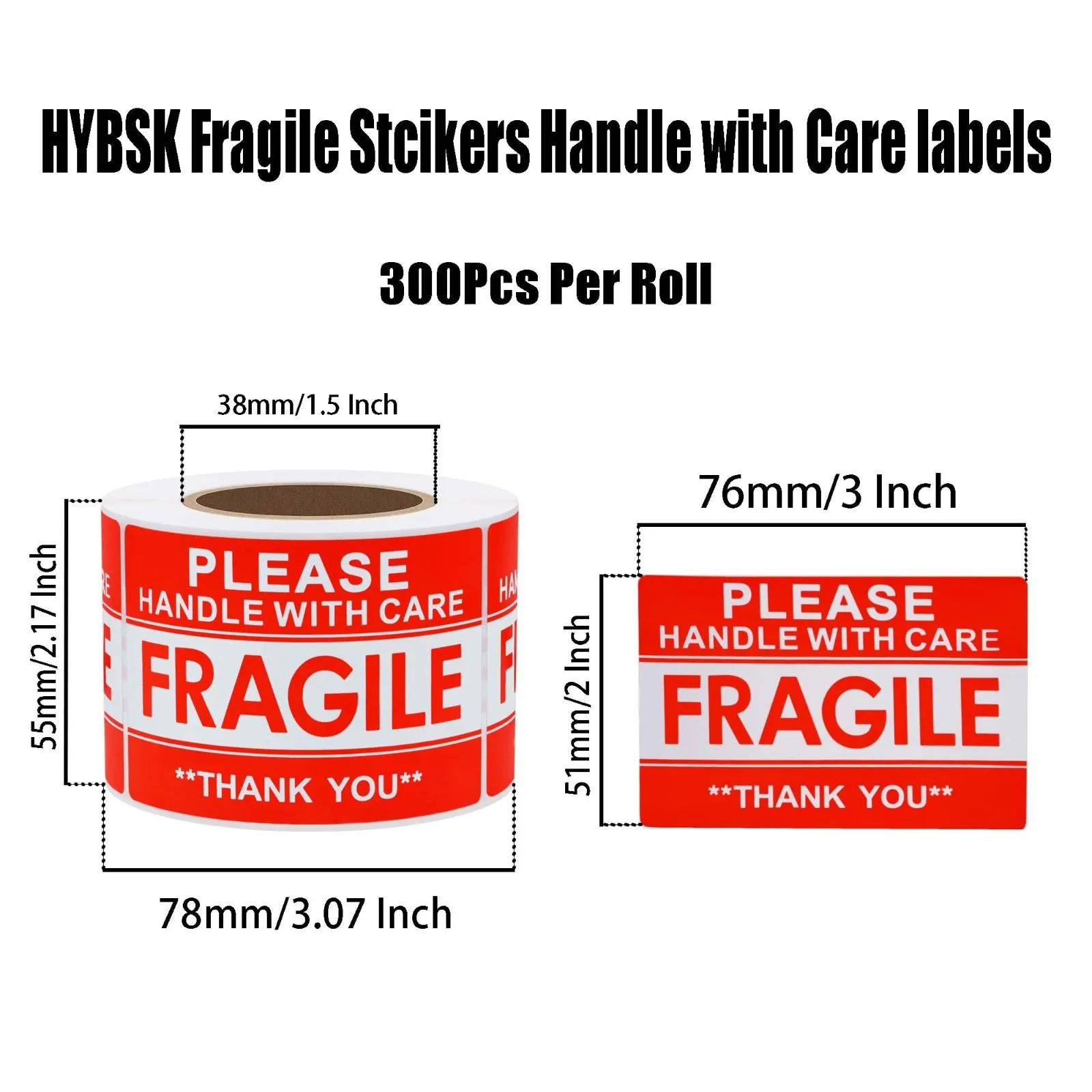 Hybsk fragile シール fragile ステッカー 処理注意配送シール 注意搬送と梱包警告接着ラベル 1巻300枚 (51x76mm)