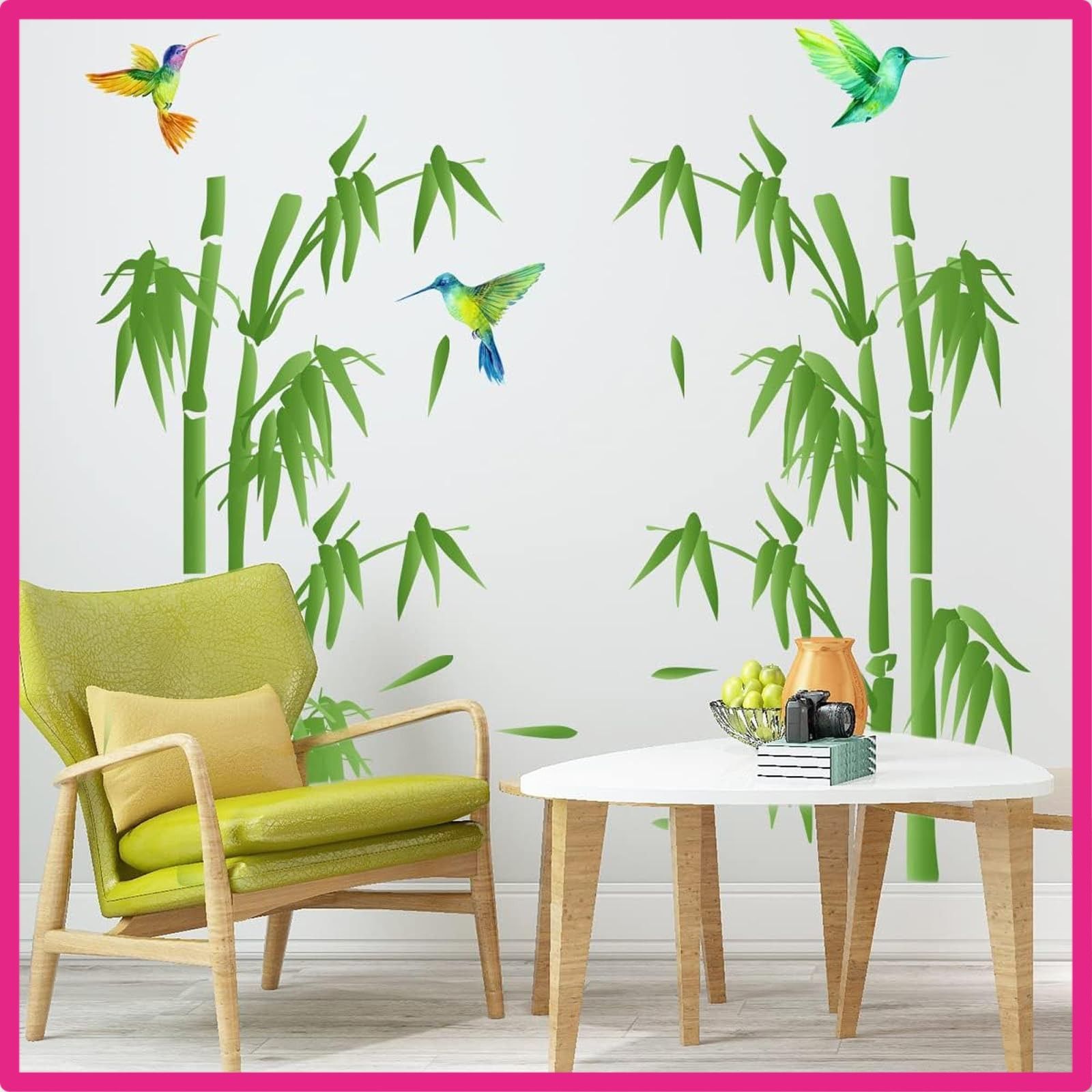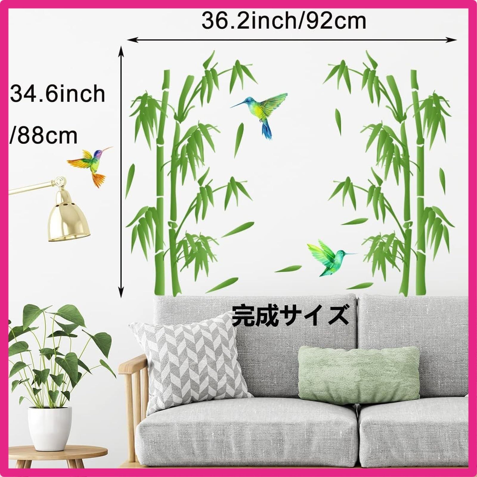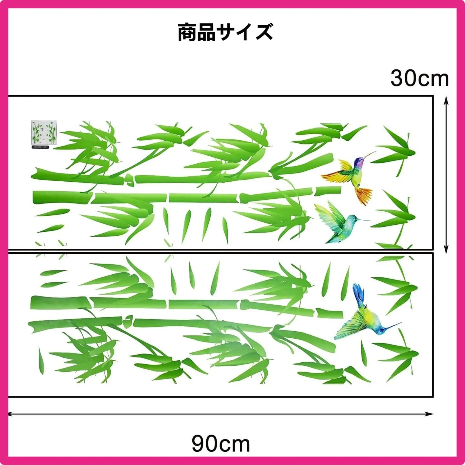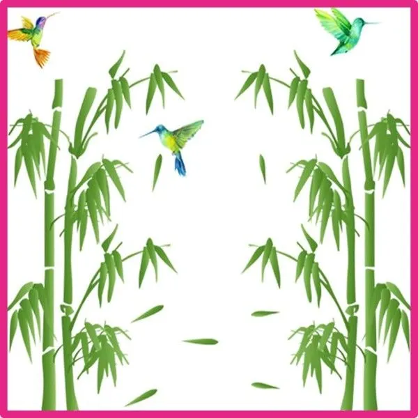 デザイン:生き生きとした緑色の竹とハチドリの一対が、まるで静かな竹林の中にいるかのようです。