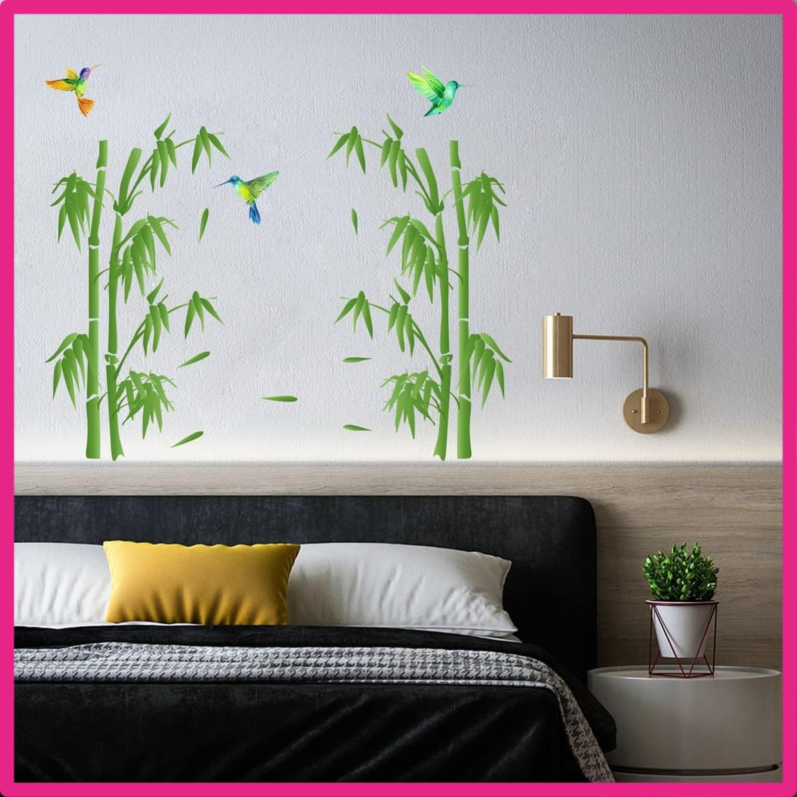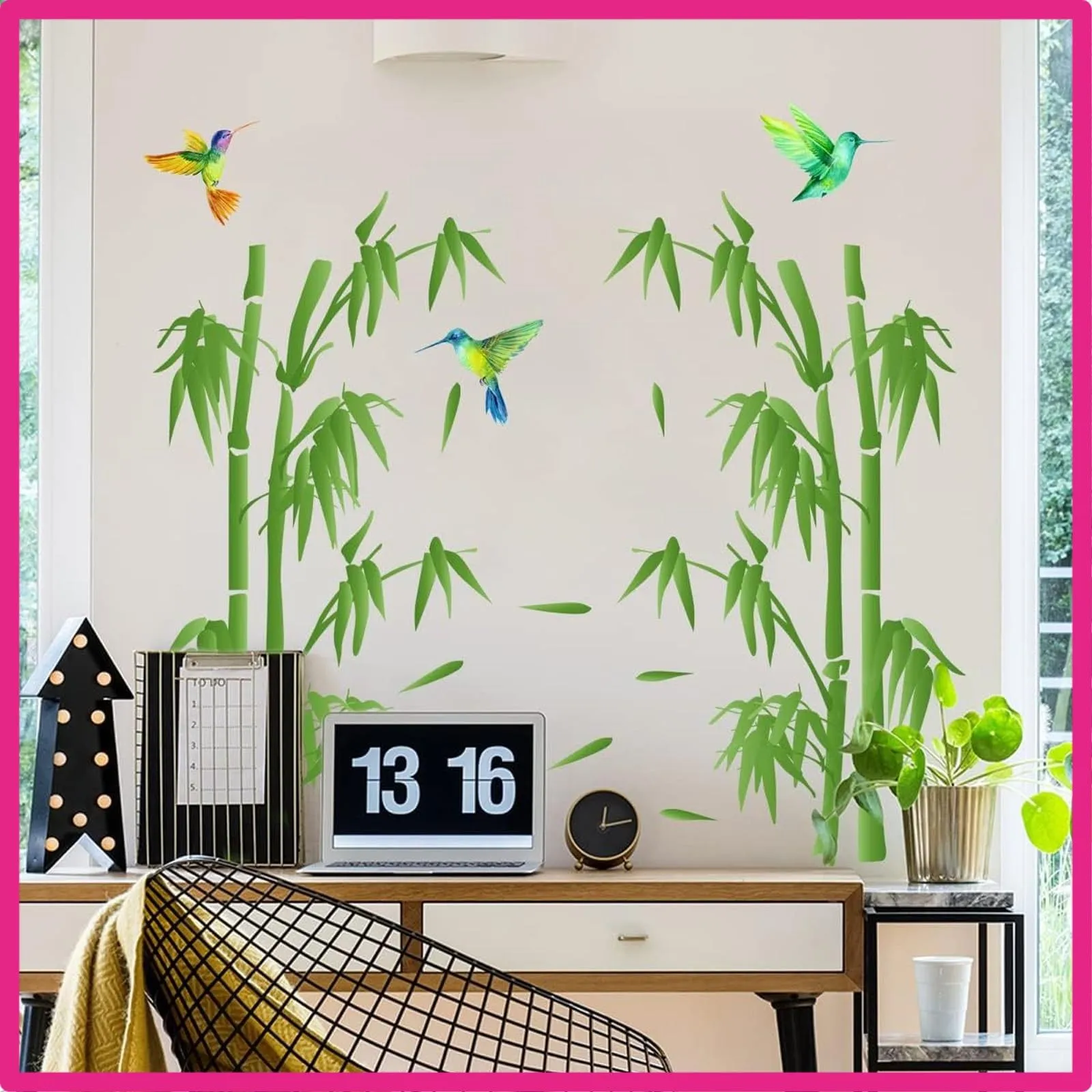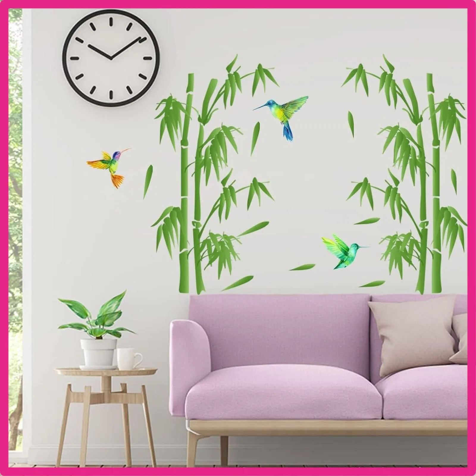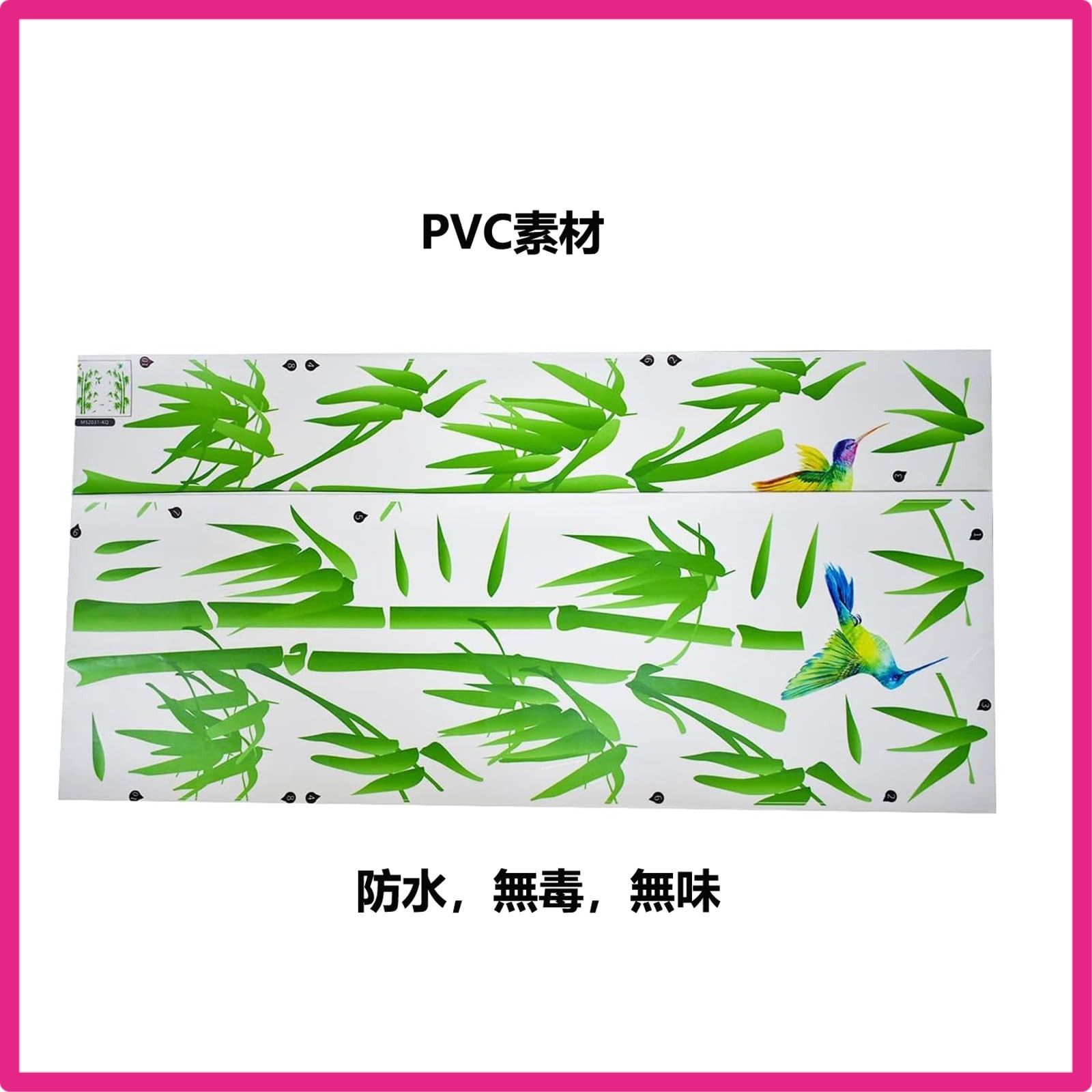 デザイン:生き生きとした緑色の竹とハチドリの一対が、まるで静かな竹林の中にいるかのようです。