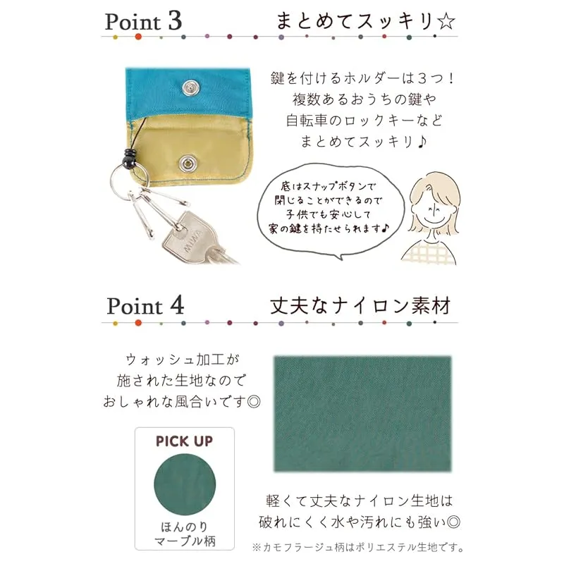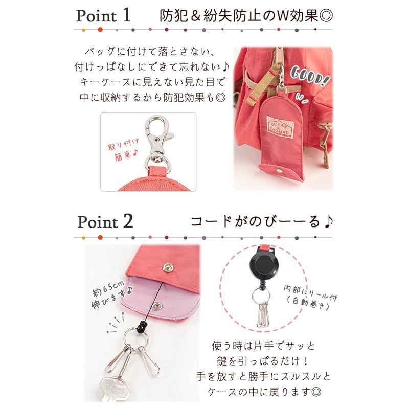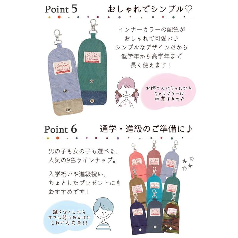 【商品概要】 リピーター多数! 大人気キッズ服ブランド「OCEAN & GROUND」から、インナーカラーの配色がお洒落なキーケース! 自動巻きのリール付きなので、ランドセルやベルトループに付けたまま使えてとっても便利!鍵をうっかり落としてしまう心配もありません◎ 鍵をつけるフックは3つ!家の鍵や自転車の鍵など、複数ある鍵もまとめてスッキリ!中身が見えないので防犯対策にも◎ 軽くて丈夫なナイロン生地で、破れにくくて水や汚れにも強い!シンプルで機能的なデザインは、低学年から高学年まで長く使えます♪ No.13555, color : ライトピンク / スモーキーピンク / ライラック / タン / グリーン / エメラルドグリーン / ネイビー / ダークネイビー / カモ, 生産国:中国