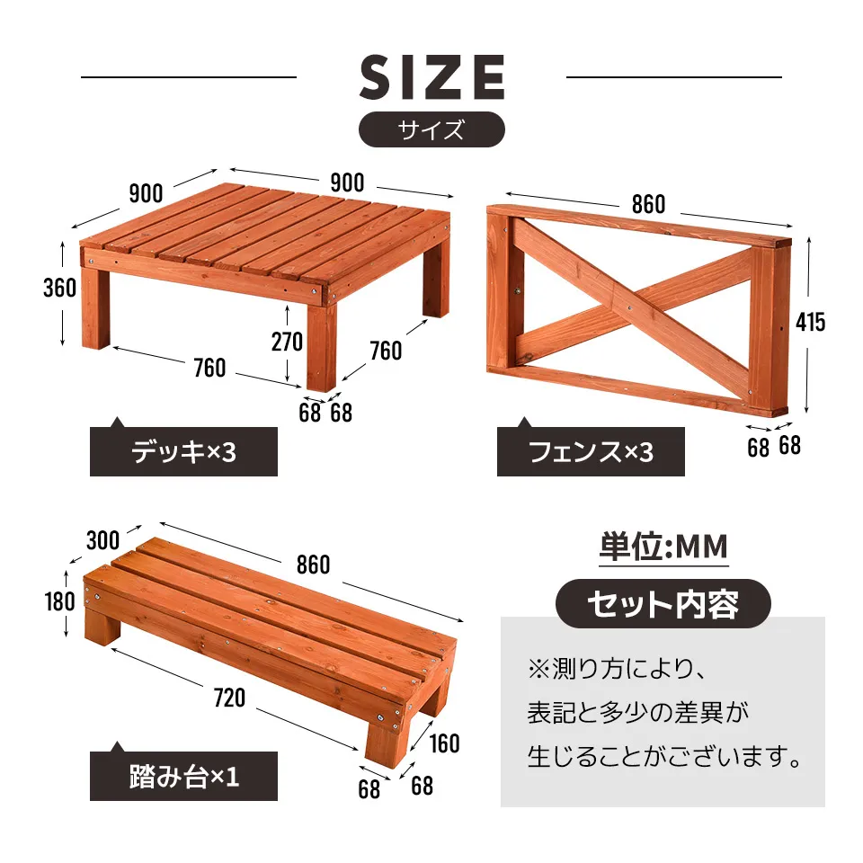 ◆07セット内容:デッキ×3、フェンス×3、踏み台×1 ・Attention ・ご注意: ※お客様組み立て品となります。 ※本商品の組み立てやご使用に際しては、乱暴に扱いますと損害やケガの原因となりますので、丁寧にお取り扱いください。 ※商品デザインは、品質に差し支えない程度に、予告なく変更する場合があります。 ※新しく入荷した商品は今まで販売していた商品と色差がある場合がございます。 ※商品のデザインが写真と違う場合がございますが品質上の問題なく使えますのでご了承下さい。 ※必ず水平で、安定した場所に設置してください。 ※運送途中に損害をもたらす可能があり、ご心配なく気軽に弊社とご連絡ください。 ※大型商品ですので、開梱後のお客様都合による、ご返品を承る事が出来かねます。