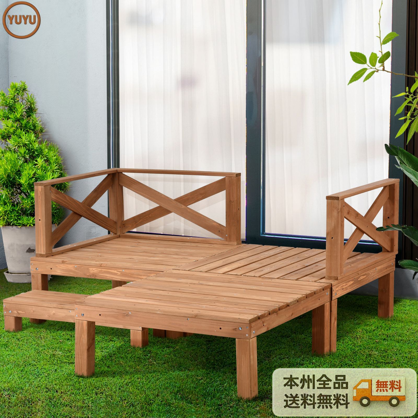 ◆06アレンジ可能!自由な組み合わせ ・フェンスはデッキの四隅に設置できるから、お好みの向きで設置可能。 ・踏み台も置き型タイプなので、お好みの位置をお選びいただけます。 ・場所にあわせてスタイル自由自在。 ・