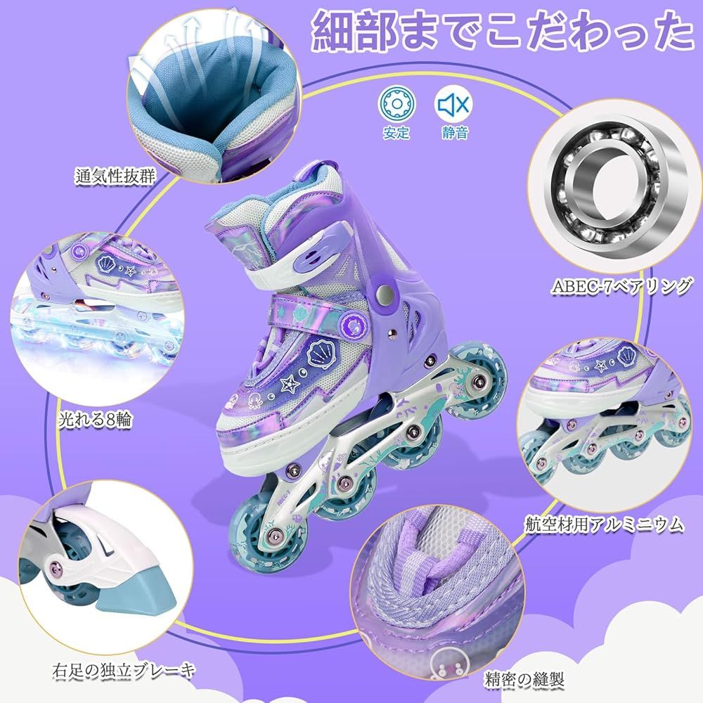 【安定性に優れたと滑らかさ】当社のインラインスケートは軽量かつ高強度のアルミ合金フレームとABEC-7精密ベアリングを採用しています。振動を吸収し、スムーズで静かな滑りを実現。PUホイールとクッション性の高いインソールで、長時間の練習でも快適です。