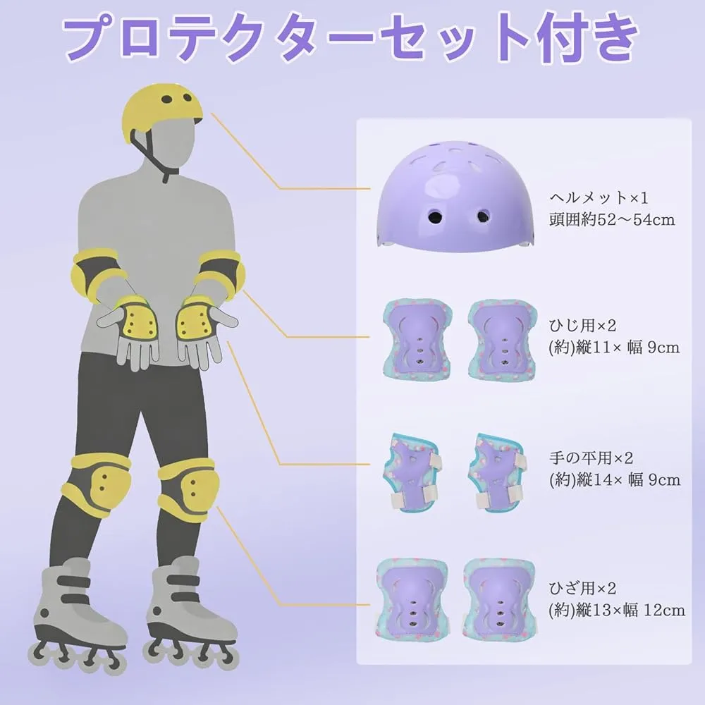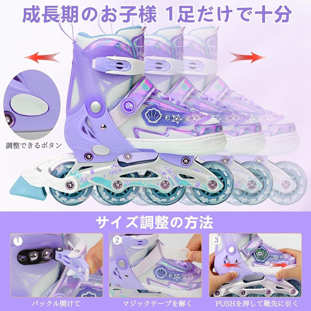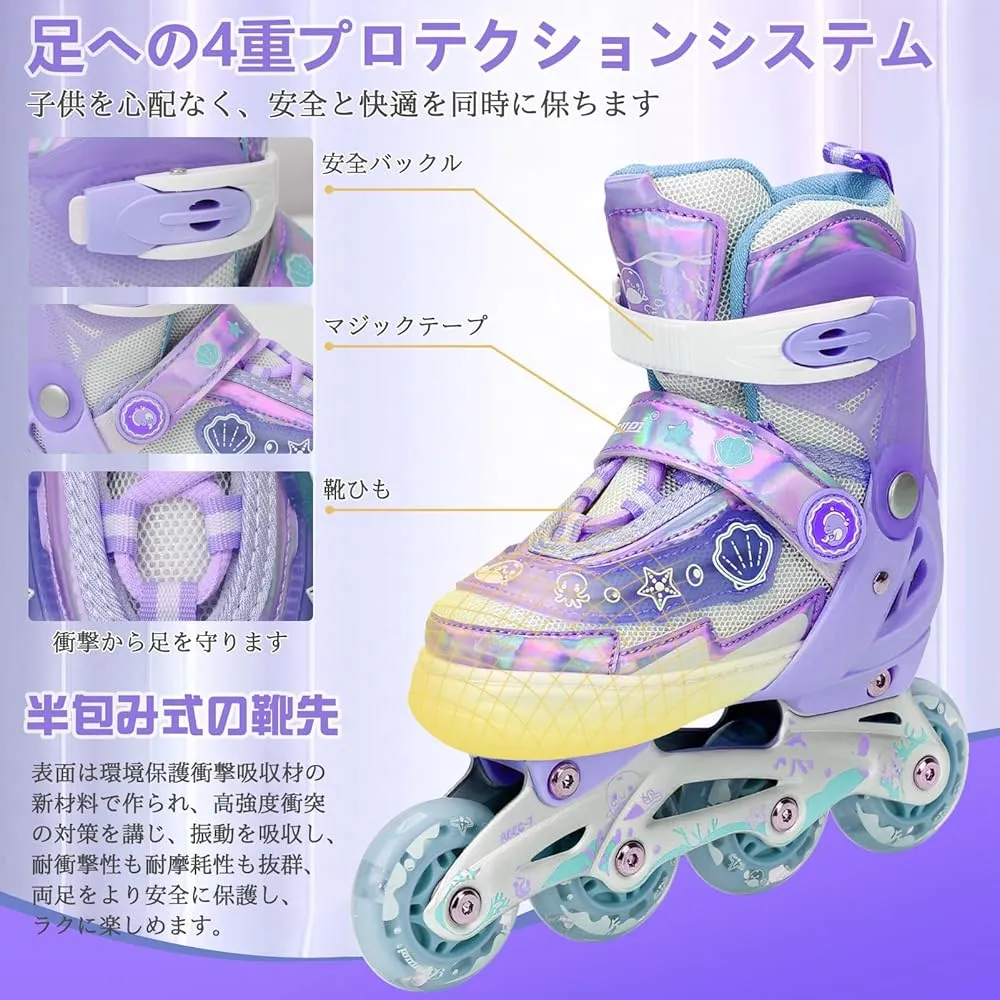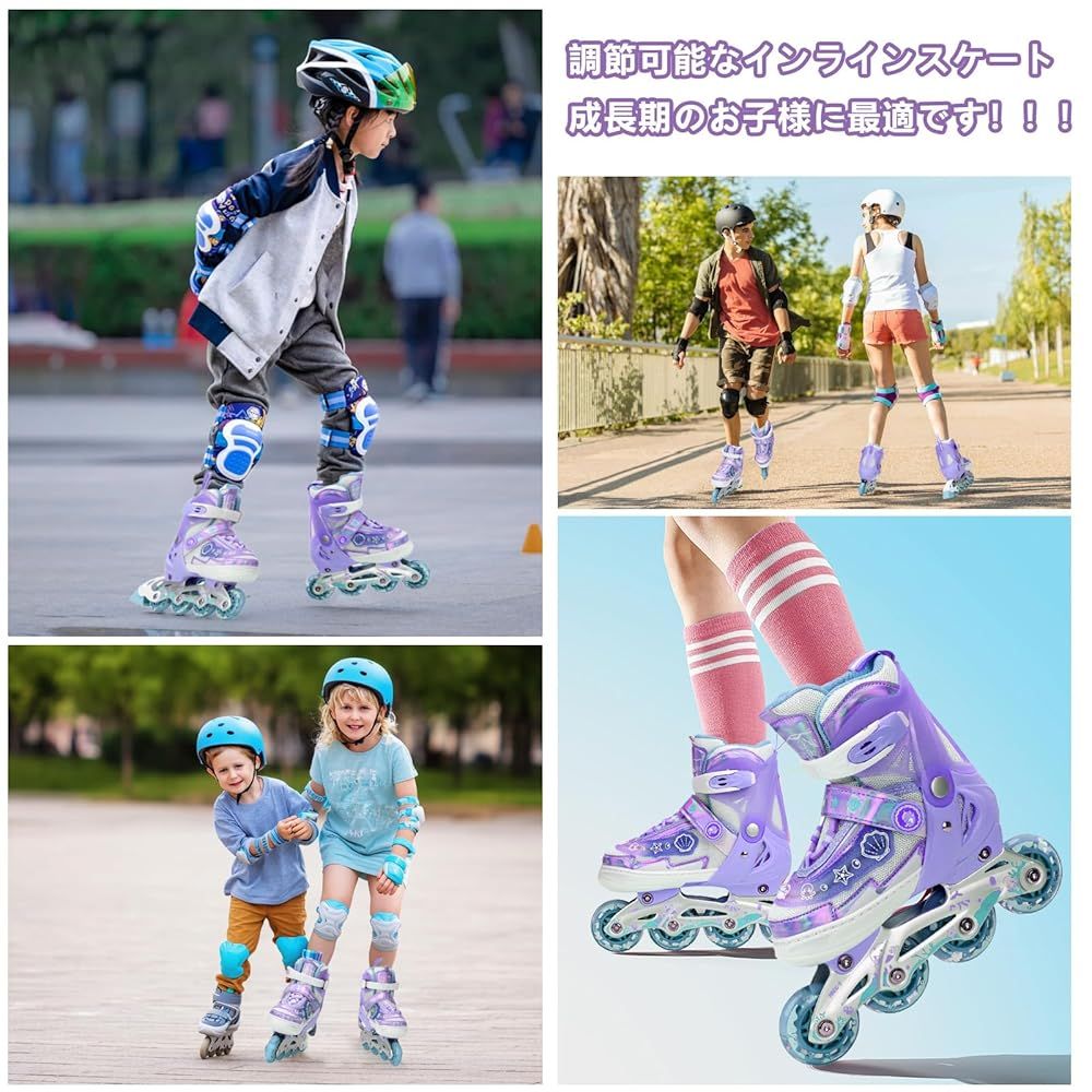 【ワンタッチサイズ調整で長く使える】お子様の成長に合わせて、ボタン操作で4段階のサイズ調整が可能(XSサイズ: 内寸15.5-18cm、Sサイズ: 内寸18.5-21cm、Mサイズ: 内寸21.5-24cmなど)。工具不要で、PUSHボタンを押すと4段階のサイズに変更できます、お子様の成長によってサイズを調整して超簡単!経済的で環境にも優しいローラーブレード 子供用として最適です。セット内容:インラインスケート本体+プロテクター4点(ヘルメット・肘・膝・手首)。子供の頭や肘、膝などを保護し、安心して遊ばせます。