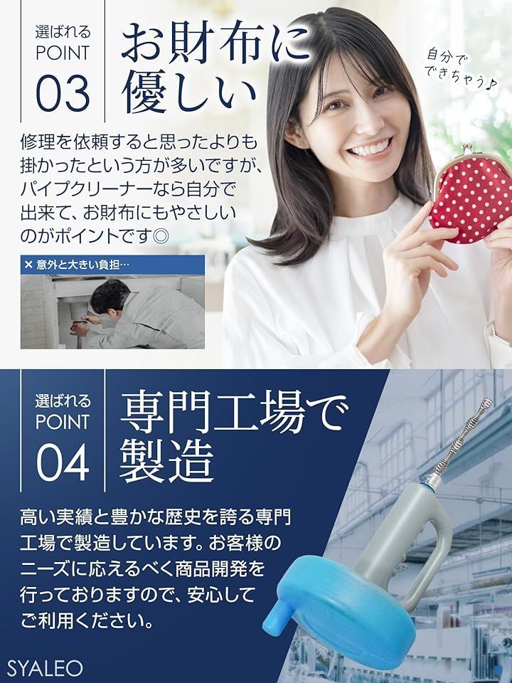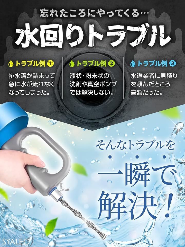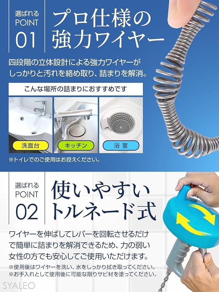 「商品仕様」*ワイヤー長さ:4.5m *使用場所:洗面台/キッチン/浴室 *対応可能排水溝サイズ:直径2.0cm以上 *セット内容:パイプクリーナー本体、取扱説明書 *ブランド:SYALEO