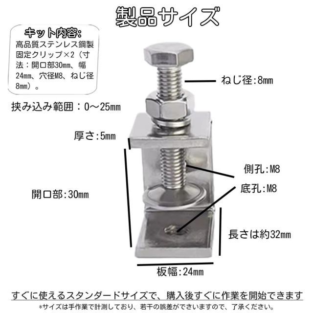 【パッケージ内容|スタンダード仕様で即利用】高品質ステンレス鋼製固定クリップ×2(寸法:開口部30mm、幅24mm、穴径M8、ねじ径8mm)(寸法:開口部20mm、幅24mm、穴径M8、ねじ径8mm)。すぐに使えるスタンダードサイズで、購入後すぐに作業を開始できます。
