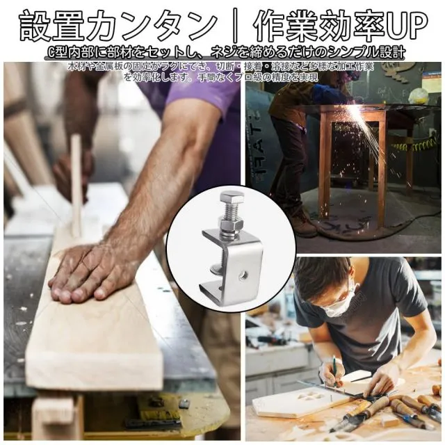 【設置カンタン|作業効率UP】C型内部に部材をセットし、ネジを締めるだけのシンプル設計。木材や金属板の固定がラクにでき、切断・接着・溶接など多様な加工作業を効率化します。手間なくプロ級の精度を実現。