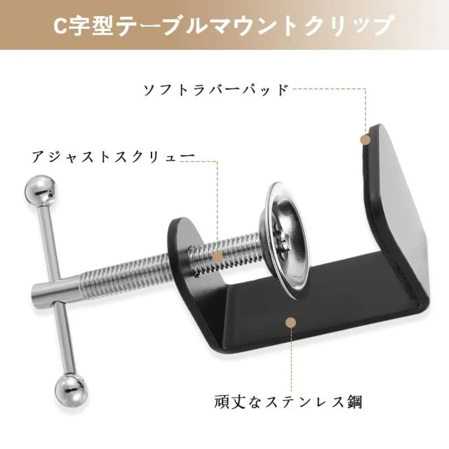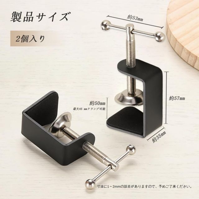 【商品仕様】C型クランプは2個、最大開口幅45mm。開口距離を自由に調節でき、10mm~45mmの各種素材を固定できる。