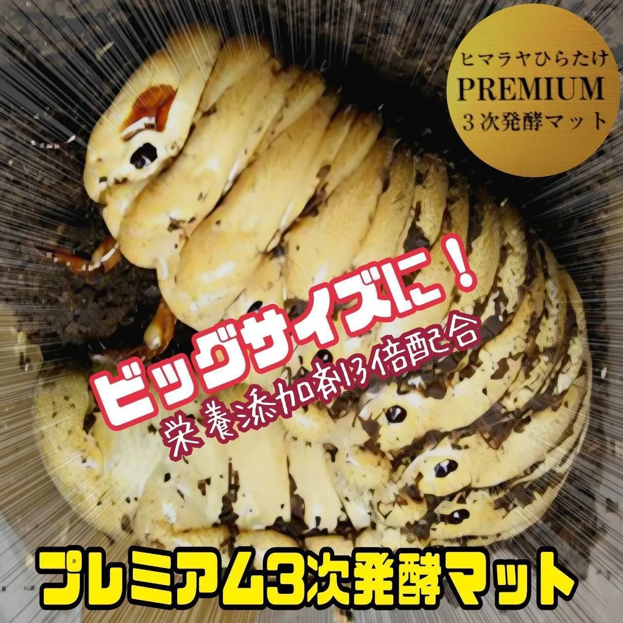 別途出品してある国産カブト用のノーマルの「ヒマラヤひらたけマット」を精密なマシーンでさらに微粒子に粉砕して幼虫が食べやすくしトレハロースやグルコース、キトサン、ローヤルゼリー、高活性グルテン、アルギニン、カルシウム、ミネラル、酵素、酵母菌、特殊アミノ酸などの栄養添加剤を贅沢に通常3倍配合した拘りの特選プレミアムマットです。