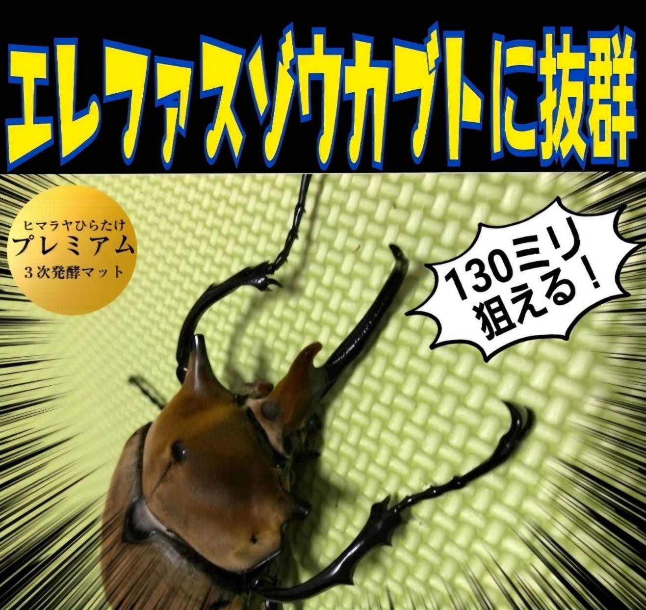 【羽化実績】 ヘラクレスヘラクレス182ミリ リッキー165ミリ ネプチューン155ミリ コーカサス127ミリ マルス131ミリ 国産カブト87ミリ ヘラクレスなどの外産はもちろん国産のカブトムシもギネスサイズがでています。 他にもヘラクレス亜種、シロカブト、ゾウカブトなどでも多数大型実績あります。 ミヤマクワガタやノコギリクワガタ、ヒラタクワガタ、オオクワガタ、ニジイロクワガタなどクワガタ全般もこのマットで大きくなったとの報告をたくさん頂いています。 クワガタでは特にミヤマクワガタではギネス級が羽化しています。 とにかく幼虫の食い付きがよくモリモリ食べます。 大型の成虫にするポイントは幼虫期間にどれだけたくさんの質の良い餌を食べさせることができるかです。 高カロリーで絶妙なバランスの栄養添加剤配合の「ヒマラヤひらたけプレミアム3次発酵マット」は幼虫の餌の中では最高峰です。 特にヘラクレスなど外産ブリーダーの方から好評でリピート注文をたくさん頂いています。 全国の昆虫ショップやカブトムシ、クワガタ専門店からも注目されお陰様で定期的に大量の注文を頂いています。 産卵マットに使うとメスが大量に卵を産みます。 ヘラクレスは1頭のメスが130個以上産んだ実績あります。 国産カブトムシでは1匹のメスが90個の産卵実績。 この発酵マットの愛用者にはビークワコンテストで何度も上位入賞されてる方もいます。 カブトムシ、クワガタの飼育を長年やってきて、マットも色々と実験を繰り返してきました。 試行錯誤した結果一番大きく元気に育ったのが「ヒマラヤひらたけプレミアム発酵マット」でした。 雑菌処理も完璧にやってありますので雑虫やコバエもわきません。