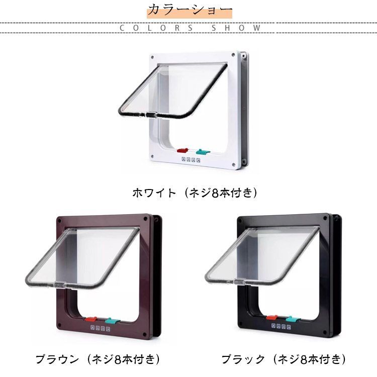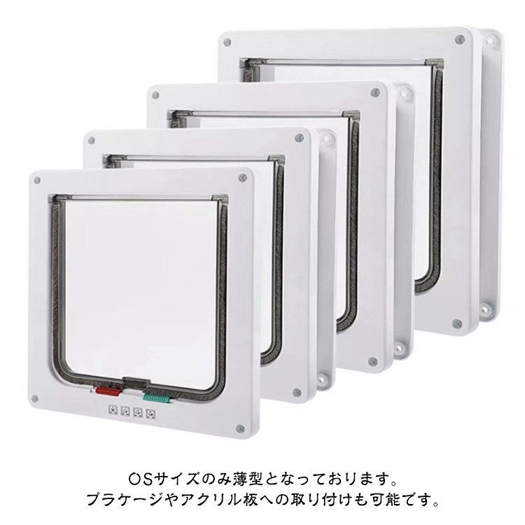 ■自動で閉まる 下部に磁石を取り付けているため、勝手に閉まってくれます。すきま風で冷気が流れるのを防ぎます。 〇下のつまみで扉が開く方向を調整できるので、 下記4つの状態にセットできます。 (1)ロック (2)退室のみ (3)入室のみ (4)オープン 〇ドア周りに吸音ブラシがありますので、 繰返し開閉しても摩耗しづらく、音が気になりません。 〇取り付けも下記4ステップで簡単にできます。 (1)設置したい場所に鉛筆で下書き (2)下書きに合わせ、設置したい場所をのこぎり等で切り抜く (3)付属のネジでドアを取り付け、ネジ穴カバーも付けて下さい。 (4)扉下のつまみで開閉モードを設定して下さい。 〇Sサイズのみ薄型となっております。 プラケージやアクリル板への取り付けも可能です。