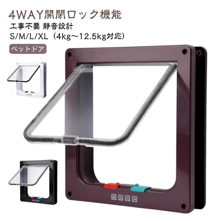 【XLサイズ】 /外寸27.7*25*5.5cm /内寸22*20cm /重さ約585g /体重12.5kg胴回り75cm以下対応 ※必ず事前に取付箇所のサイズをお確かめください。 ※出入口サイズ(開口サイズ)にペットの胴回りが 納まるかどうかご確認ください。 素材:本体:亜鉛板+紛体塗装 出入口:ABS 色:ホワイト(ネジ8本付き) ブラウン(ネジ8本付き) ブラック(ネジ8本付き) 4WAY開閉ロック機能 工事不要 静音設計 ペットドア S/M/L/XL(4kg~12.5kg対応)
