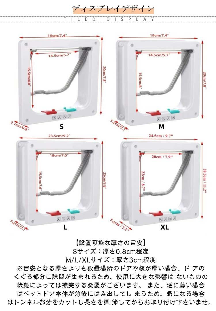 【設置可能な厚さの目安】 Sサイズ:厚さ0.8cm程度 M/L/XLサイズ:厚さ3cm程度 ※目安となる厚さよりも設置場所のドアや板が厚い場合、ド アのくぐる部分に隙間が生まれるため、使用に大きな影響は ないものの状態によっては補完する必要がございます。 また、逆に薄い場合はペットドア本体が前後にはみ出してし まうため、気になる場合はトンネル部分をカットし長さを調 節してからお取り付け下さいませ。 メルカリ店は最大10個の選択項目しか設定できないです。 いずれの色とサイズ注文後、ご注文番号と注文希望の色/サイズをご連絡ください、こちらご連絡通りのサイズと色で手配対応可能です。