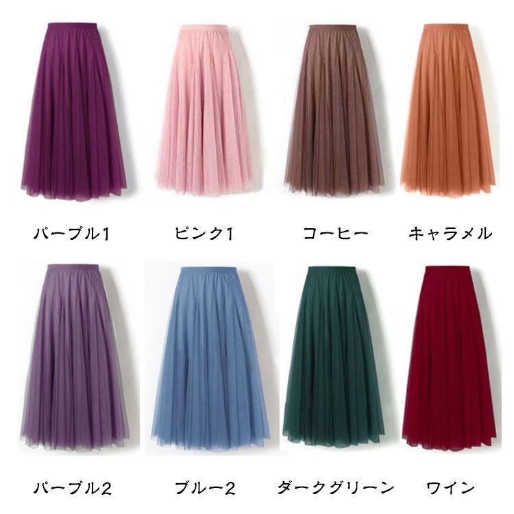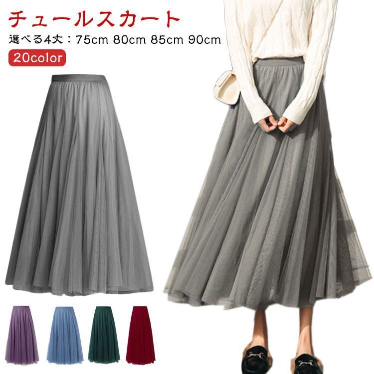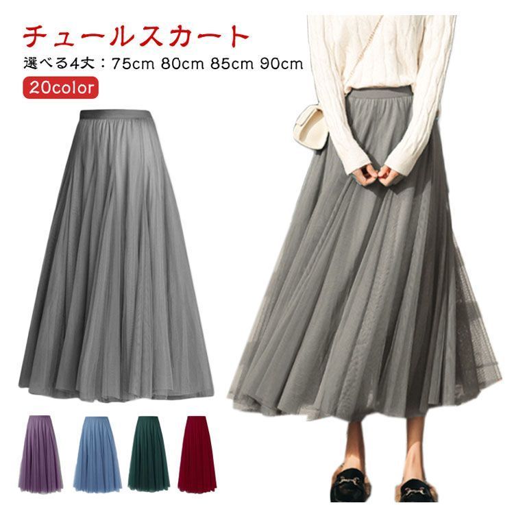 ■沖縄・離島は配送料が異なります。ご購入前にコメントをお願いいたします。 商品詳細 サイズ - 75cm - 80cm - 85cm - 90cm サイズについて - フリーサイズ(ウエストゴム仕様) - 着丈:75cm / 80cm / 85cm / 90cm からお選びいただけます。 - ※上記サイズは平置き実寸です。実寸は商品により1-3cm程度の誤差が生じる場合がございます。 素材 - ポリエステル カラー(全20色) - ホワイト - パープル1 - ブラック - ライトグレー - ブルー1 - ピンク1 - ライトグリーン - ベージュ - コーヒー - レッド - ネイビー - ブルー2 - パープル2 - キャラメル - ダークグリーン - ワイン - ダークグレー - ピンク2 - ローズピンク - ブルー3 --- 商品の特徴 - 選べる4丈 75cm、80cm、85cm、90cmの4つの着丈からお選びいただけます。 - 大人かわいいチュールスカート 10枚チュールを使用した、ふんわりと程よいボリューム感が魅力のデザインです。 - オールシーズン対応 季節を問わずご着用いただけるロング丈のフレアスカートです。 - 上品でロマンティック 上品でロマンティックな雰囲気を演出し、コーディネートの幅を広げます。 - 安心の裏地付き 軽やかで薄手のシフォン生地を使用しているため、しっかりとした裏地を付けており、安心してご着用いただけます。 - エアリーな履き心地 チュール部分は上質感のある適度なボリュームで、歩くたびにエアリーでふんわりとした印象を与えます。