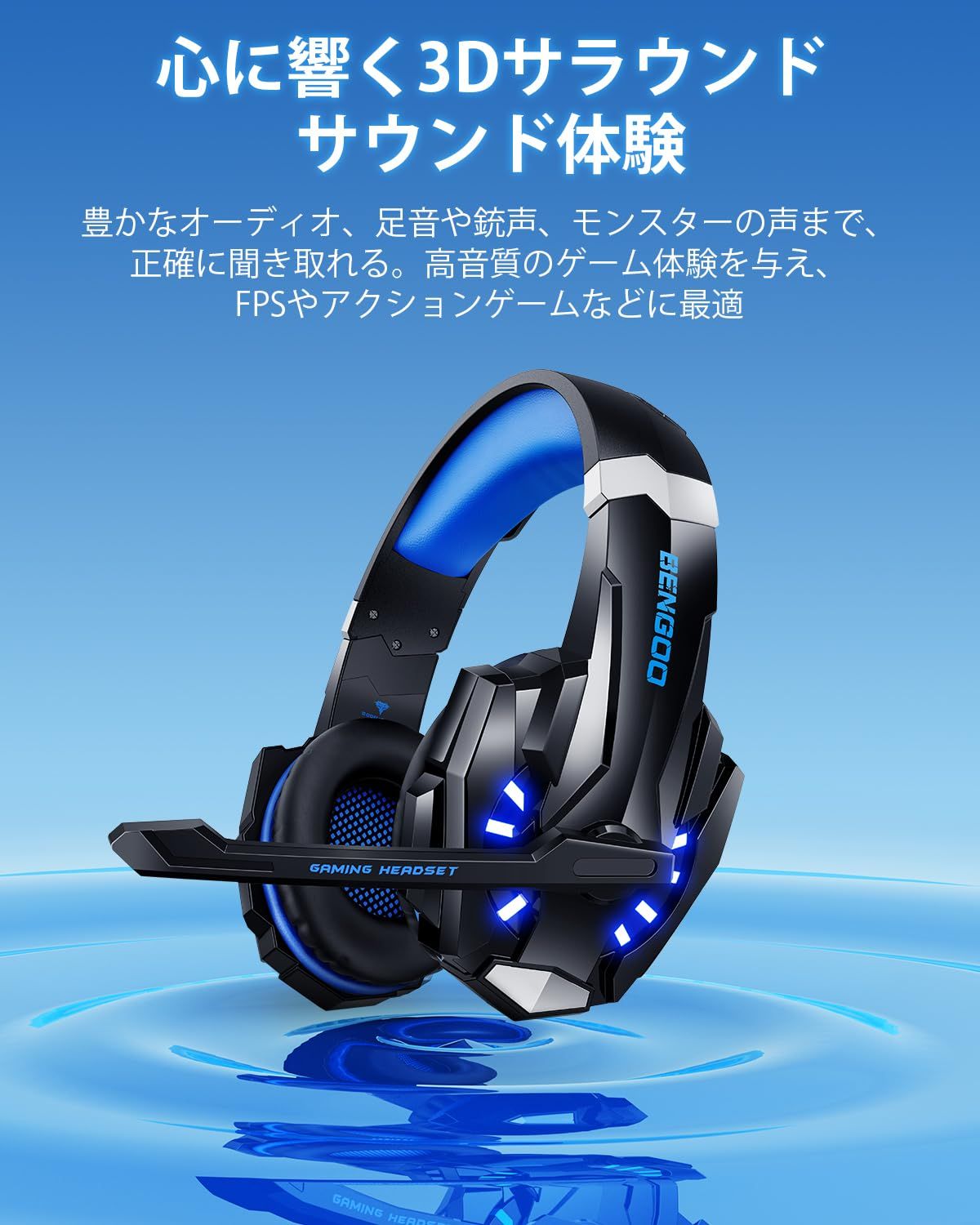BENGOO ゲーミングヘッドセット PS5 ヘッドセット ノイズキャンセリング マイク付き 3.5mm有線 ゲーミングヘッドホン スイッチ ヘッドフォン 軽量 全効能 重低音 LEDライト コントローラー ミュート付き ステレオ FPS ゲーム用 Nintendo Switch Xbox One PS4 スマホ PC対応 (青)