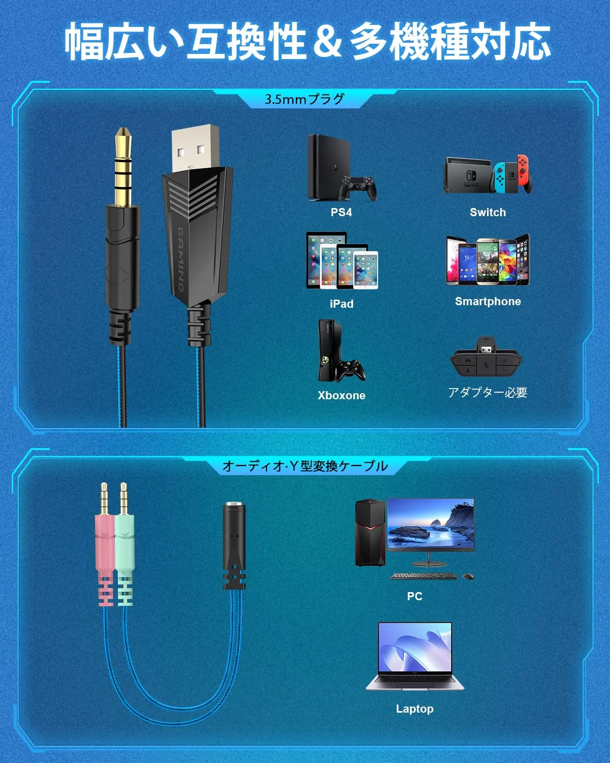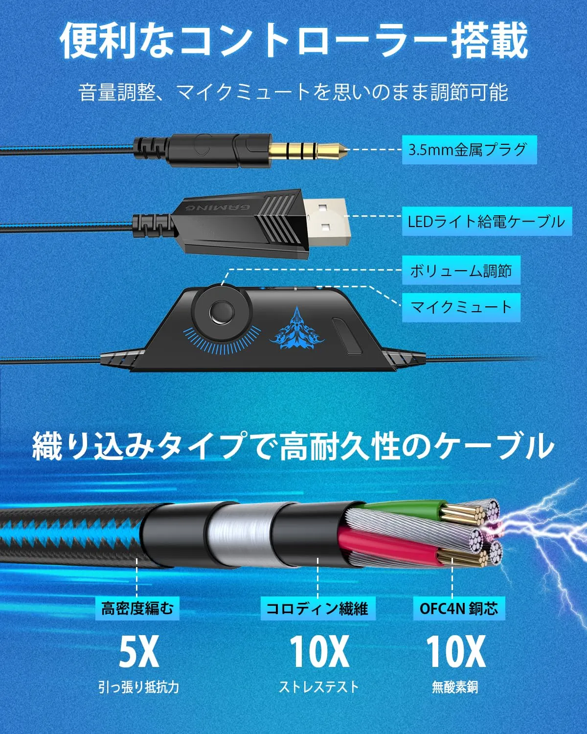 【耐久性と便利性】ワイヤーには10芯OFC無酸素銅線材の耐久性と 強度に優れた伸縮性ケーブルを採用しているため絡まりにくい設計と なっています。ヘッドバンド部分はABSとタングステン網で高い耐久 性を実現しました。調整コントローラーを手元に置けばスピーカーとマ イクの調整が即時に可能です。ご使用状況に合わせて自由自在に変化で きる商品となっております。